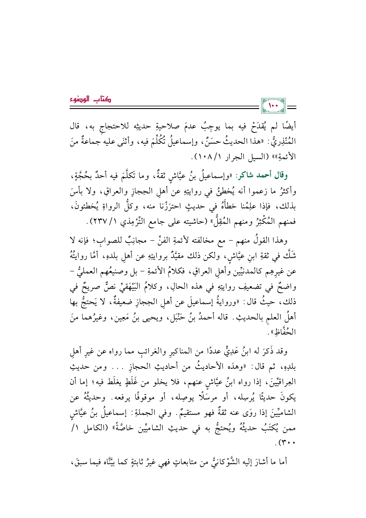 وهذا القولُ منهم -مع مخالفته لأئمةِ الفنِّ- مجانِبٌ للصوابِ؛ فإنه لا شَكَّ في ثقةِ ابنِ عيَّاشٍ، ولكن ذلك مقيَّدٌ بروايتِهِ عن أهلِ بلدهِ، أمَّا روايتُهُ عن غيرِهِم كالمدنيِّين وأهلِ العراقِ، فكلامُ الأئمةِ -بل وصنيعُهم العمليُّ- واضحٌ في تضعيفِ روايتِهِ في هذه الحالِ، وكلامُ البَيْهَقيِّ نصٌّ صريحٌ في ذلك، حيثُ قال: "وروايةُ إسماعيلَ عن أهلِ الحِجازِ ضعيفةٌ، لا يَحتجُّ بها أهلُ العلمِ بالحديثِ. قاله أحمدُ بنُ حَنْبَل، ويحيى بنُ مَعِين، وغيرُهما منَ الحُفَّاظِ".