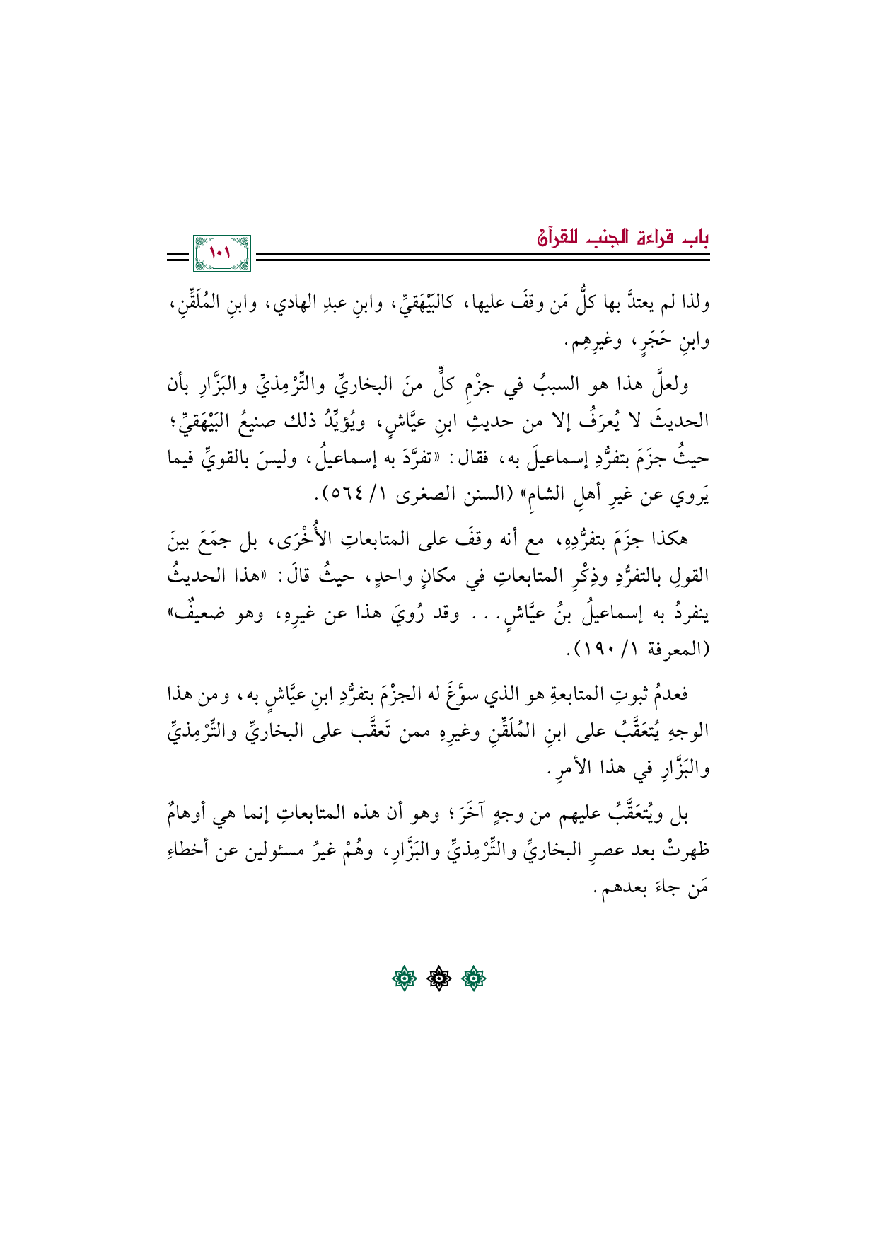 فعدمُ ثبوتِ المتابعةِ هو الذي سوَّغَ له الجزْمَ بتفرُّدِ ابنِ عيَّاشٍ به، ومن هذا الوجهِ يُتعَقَّبُ على ابنِ المُلَقِّنِ وغيرِهِ ممن تَعقَّب على البخاريِّ والتِّرْمِذيِّ والبَزَّارِ في هذا الأمرِ.