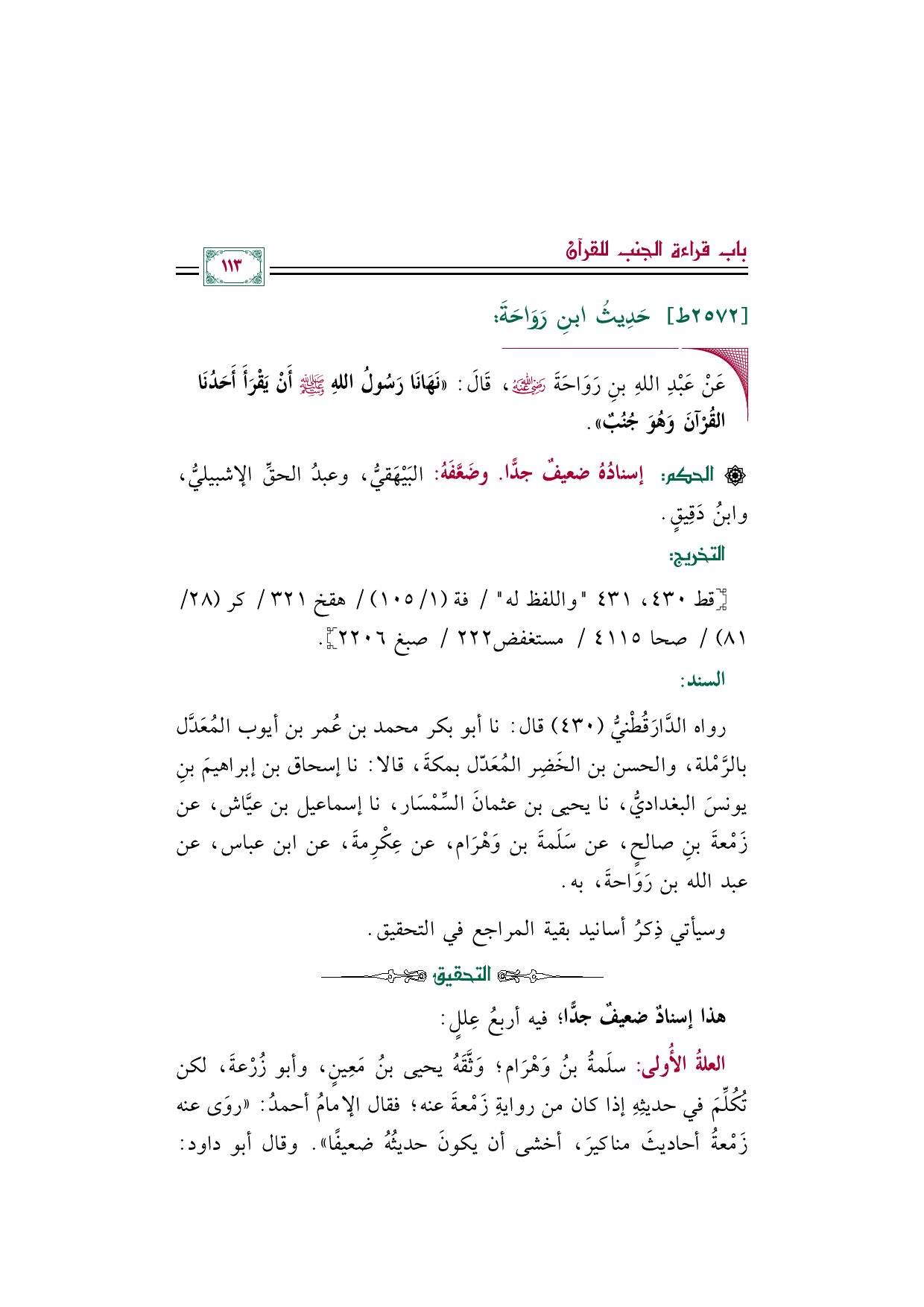 رواه الدَّارَقُطْنيُّ (٤٣٠) قال: نا أبو بكر محمد بن عُمر بن أيوب المُعَدَّل بالرَّمْلة، والحسن بن الخَضِر المُعَدّل بمكةَ، قالا: نا إسحاق بن إبراهيمَ بنِ يونسَ البغداديُّ، نا يحيى بن عثمانَ السِّمْسَار، نا إسماعيل بن عيَّاش، عن زَمْعةَ بنِ صالحٍ، عن سَلَمةَ بن وَهْرَام، عن عِكْرِمةَ، عن ابن عباس، عن عبد الله بن رَوَاحةَ، به.