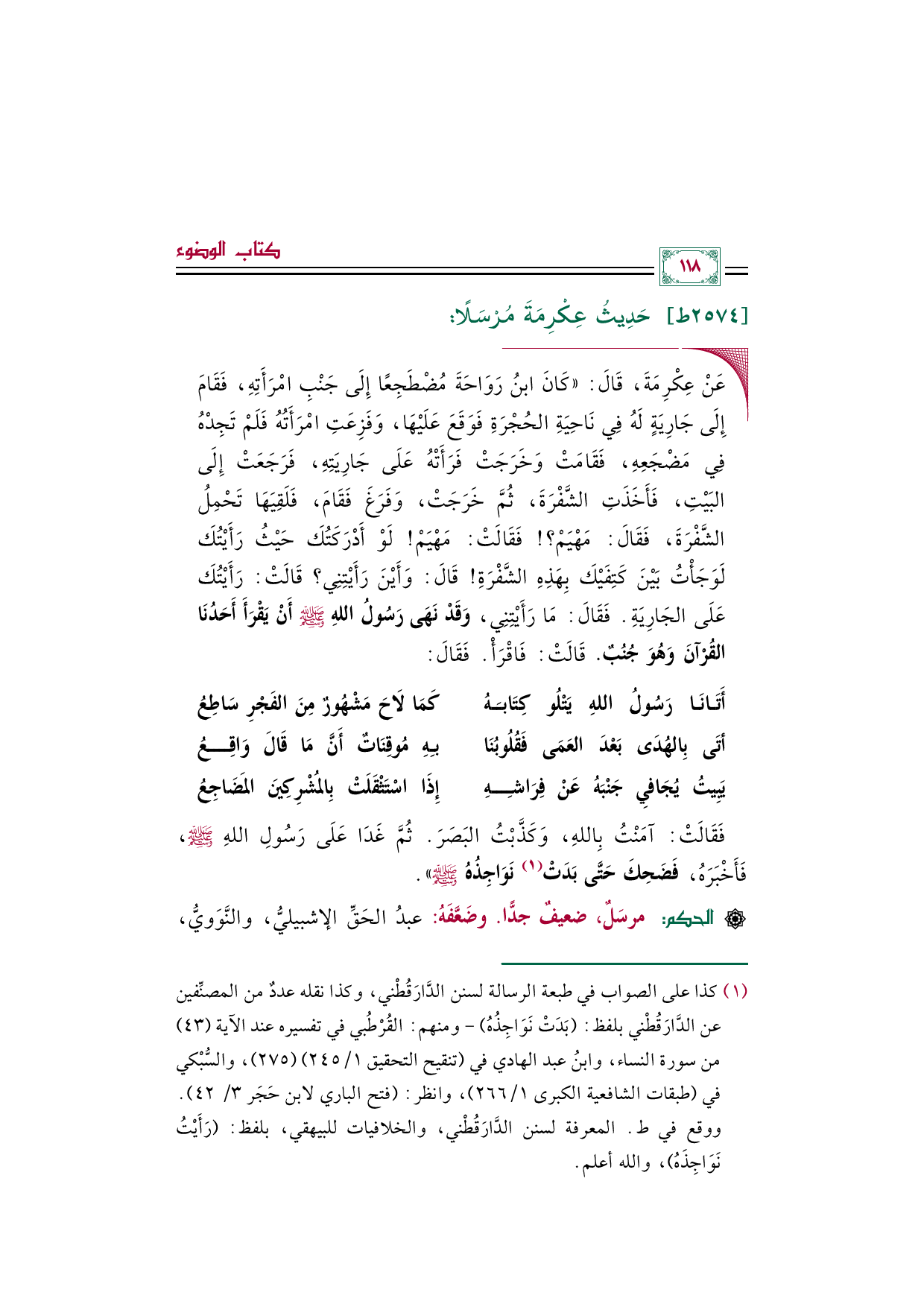 (¬١) كذا على الصواب في طبعة الرسالة لسنن الدَّارَقُطْني، وكذا نقله عددٌ من المصنِّفين عن الدَّارَقُطْني بلفظ: (بَدَتْ نَوَاجِذُهُ) -ومنهم: القُرْطُبي في تفسيره عند الآية (٤٣) من سورة النساء، وابنُ عبد الهادي في (تنقيح التحقيق ١/ ٢٤٥) (٢٧٥)، والسُّبْكي في (طبقات الشافعية الكبرى ١/ ٢٦٦)، وانظر: (فتح الباري لابن حَجَر ٣/ ٤٢). ووقع في ط. المعرفة لسنن الدَّارَقُطْني، والخلافيات للبيهقي، بلفظ: (رَأَيْتُ نَوَاجِذَهُ)، والله أعلم.
