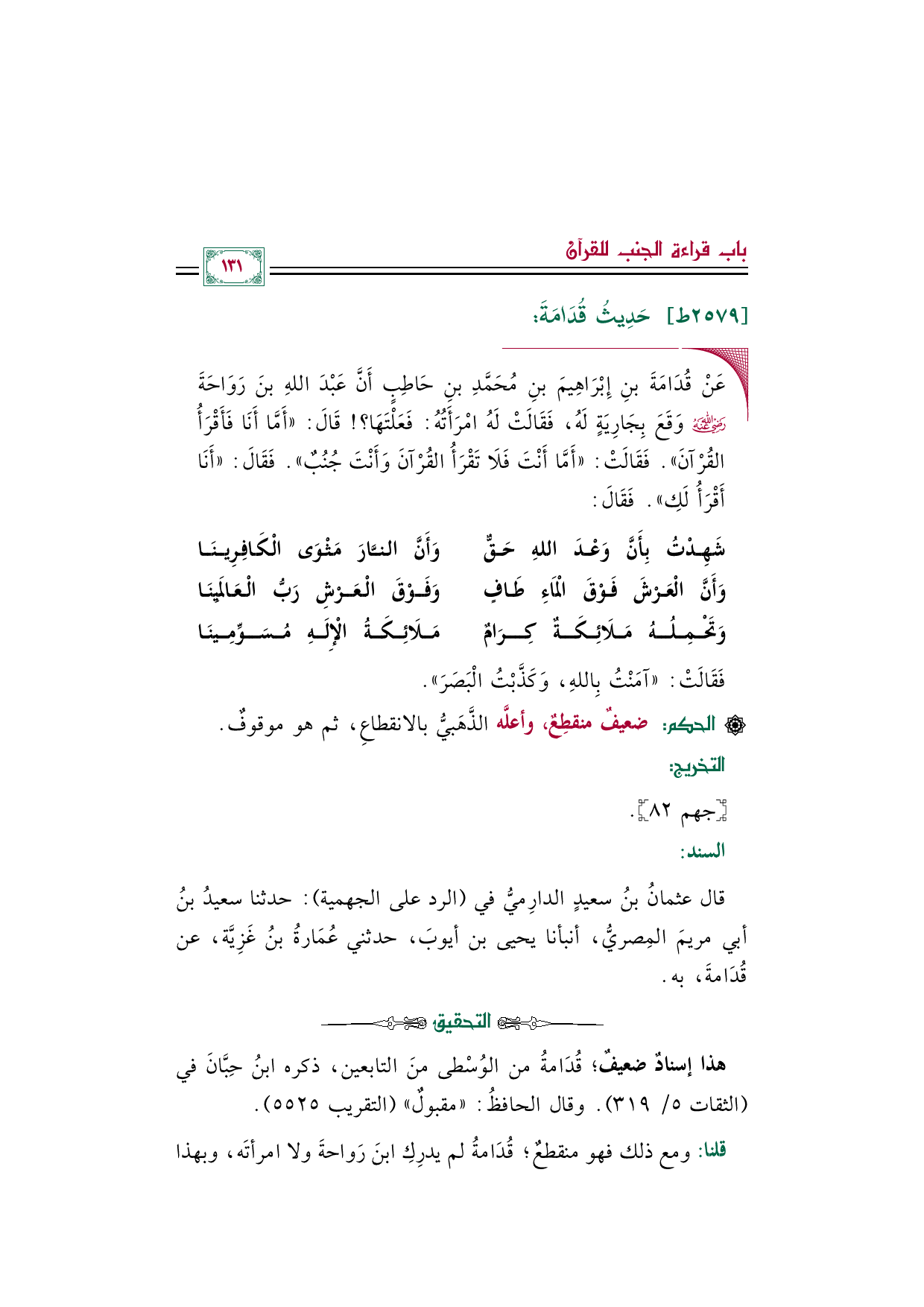 قلنا: ومع ذلك فهو منقطعٌ؛ قُدَامةُ لم يدرِكِ ابنَ رَواحةَ ولا امرأتَه، وبهذا
