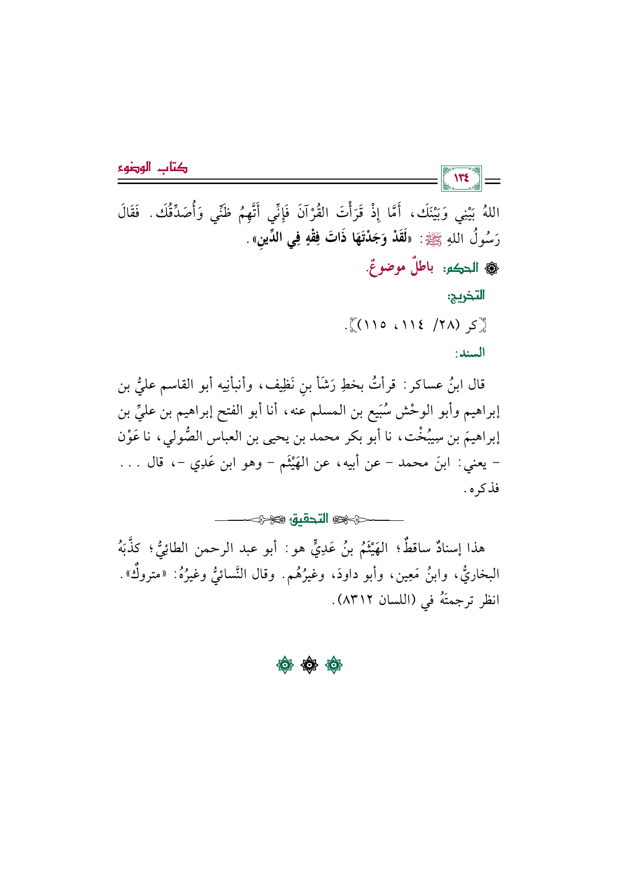 قال ابنُ عساكر: قرأتُ بخطِ رَشَأ بنِ نَظِيف، وأنبأنِيه أبو القاسم عليُّ بن إبراهيم وأبو الوحْش سُبَيع بن المسلم عنه، أنا أبو الفتح إبراهيم بن عليِّ بن إبراهيمَ بن سِيبُخْت، نا أبو بكر محمد بن يحيى بن العباس الصُّولي، نا عَوْن -يعني: ابنَ محمد- عن أبيه، عن الهَيْثَم -وهو ابن عَدِي-، قال ... فذكره.