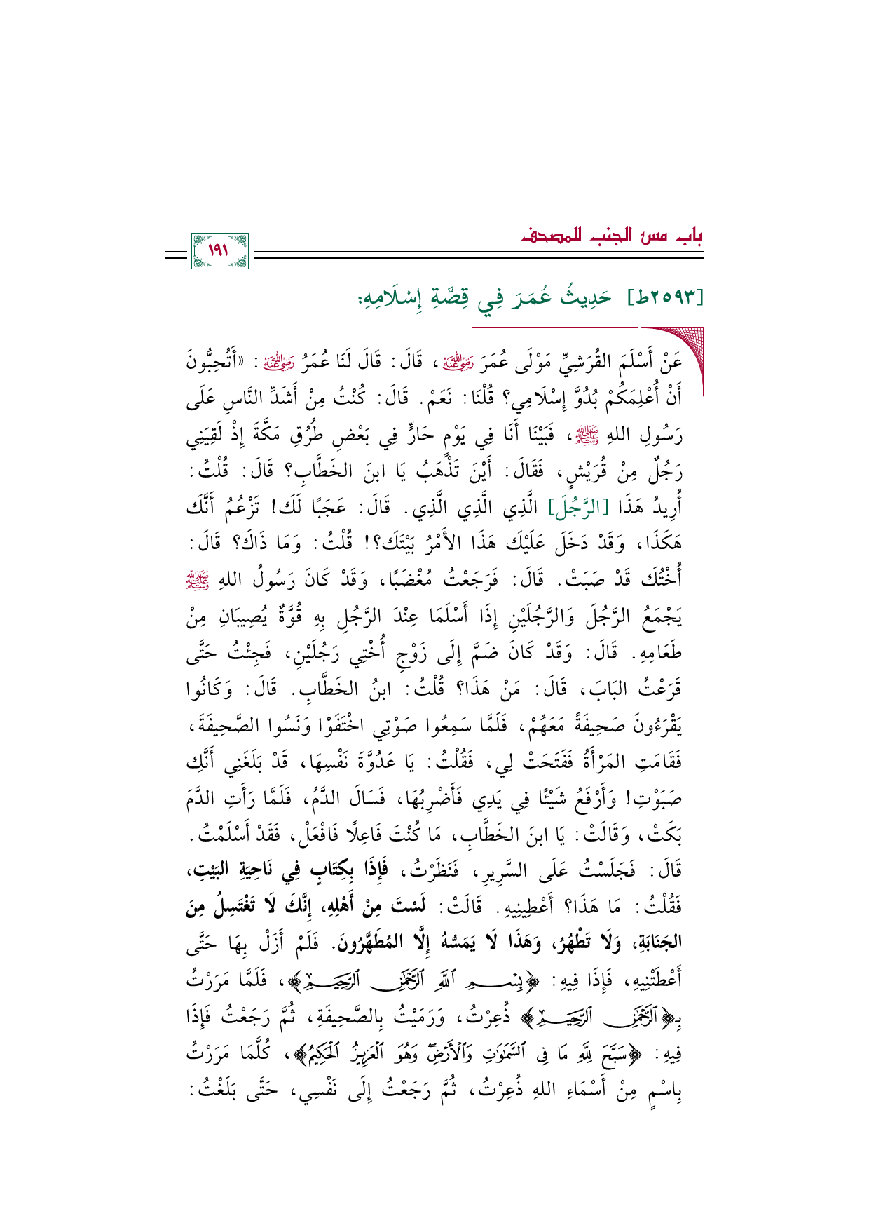 ◼ عَنْ أَسْلَمَ القُرَشِيِّ مَوْلَى عُمَرَ رضي الله عنه، قَالَ: قَالَ لَنَا عُمَرُ رضي الله عنه: ((أَتُحِبُّونَ أَنْ أُعْلِمَكُمْ بُدُوَّ إِسْلَامِي؟ قُلْنَا: نَعَمْ. قَالَ: كُنْتُ مِنْ أَشَدِّ النَّاسِ عَلَى رَسُولِ اللهِ صلى الله عليه وسلم، فَبَيْنَا أَنَا فِي يَوْمٍ حَارٍّ فِي بَعْضِ طُرُقِ مَكَّةَ إِذْ لَقِيَنِي رَجُلٌ مِنْ قُرَيْشٍ، فَقَالَ: أَيْنَ تَذْهَبُ يَا ابنَ الخَطَّابِ؟ قَالَ: قُلْتُ: أُرِيدُ هَذَا [الرَّجُلَ] الَّذِي الَّذِي الَّذِي. قَالَ: عَجَبًا لَكَ! تَزْعُمُ أَنَّكَ هَكَذَا، وَقَدْ دَخَلَ عَلَيْكَ هَذَا الأَمْرُ بَيْتَكَ؟ ! قُلْتُ: وَمَا ذَاكَ؟ قَالَ: أُخْتُكَ قَدْ صَبَتْ. قَالَ: فَرَجَعْتُ مُغْضَبًا، وَقَدْ كَانَ رَسُولُ اللهِ صلى الله عليه وسلم يَجْمَعُ الرَّجُلَ وَالرَّجُلَيْنِ إِذَا أَسْلَمَا عِنْدَ الرَّجُلِ بِهِ قُوَّةٌ يُصِيبَانِ مِنْ طَعَامِهِ. قَالَ: وَقَدْ كَانَ ضَمَّ إِلَى زَوْجِ أُخْتِي رَجُلَيْنِ، فَجِئْتُ حَتَّى قَرَعْتُ البَابَ، قَالَ: مَنْ هَذَا؟ قُلْتُ: ابنُ الخَطَّابِ. قَالَ: وَكَانُوا يَقْرَءُونَ صَحِيفَةً مَعَهُمْ، فَلَمَّا سَمِعُوا صَوْتِي اخْتَفَوْا وَنَسُوا الصَّحِيفَةَ، فَقَامَتِ المَرْأَةُ فَفَتَحَتْ لِي، فَقُلْتُ: يَا عَدُوَّةَ نَفْسِهَا، قَدْ بَلَغَنِي أَنَّكِ صَبَوْتِ! وَأَرْفَعُ شَيْئًا فِي يَدِي فَأَضْرِبُهَا، فَسَالَ الدَّمُ، فَلَمَّا رَأَتِ الدَّمَ بَكَتْ، وَقَالَتْ: يَا ابنَ الخَطَّابِ، مَا كُنْتَ فَاعِلًا فَافْعَلْ، فَقَدْ أَسْلَمْتُ. قَالَ: فَجَلَسْتُ عَلَى السَّرِيرِ، فَنَظَرْتُ، فَإِذَا بِكِتَابٍ فِي نَاحِيَةِ البَيْتِ، فَقُلْتُ: مَا هَذَا؟ أَعْطِينِيهِ. قَالَتْ: لَسْتَ مِنْ أَهْلِهِ، إِنَّكَ لَا تَغْتَسِلُ مِنَ الجَنَابَةِ، وَلَا تَطْهُرُ، وَهَذَا لَا يَمَسُّهُ إِلَّا المُطَهَّرُونَ.