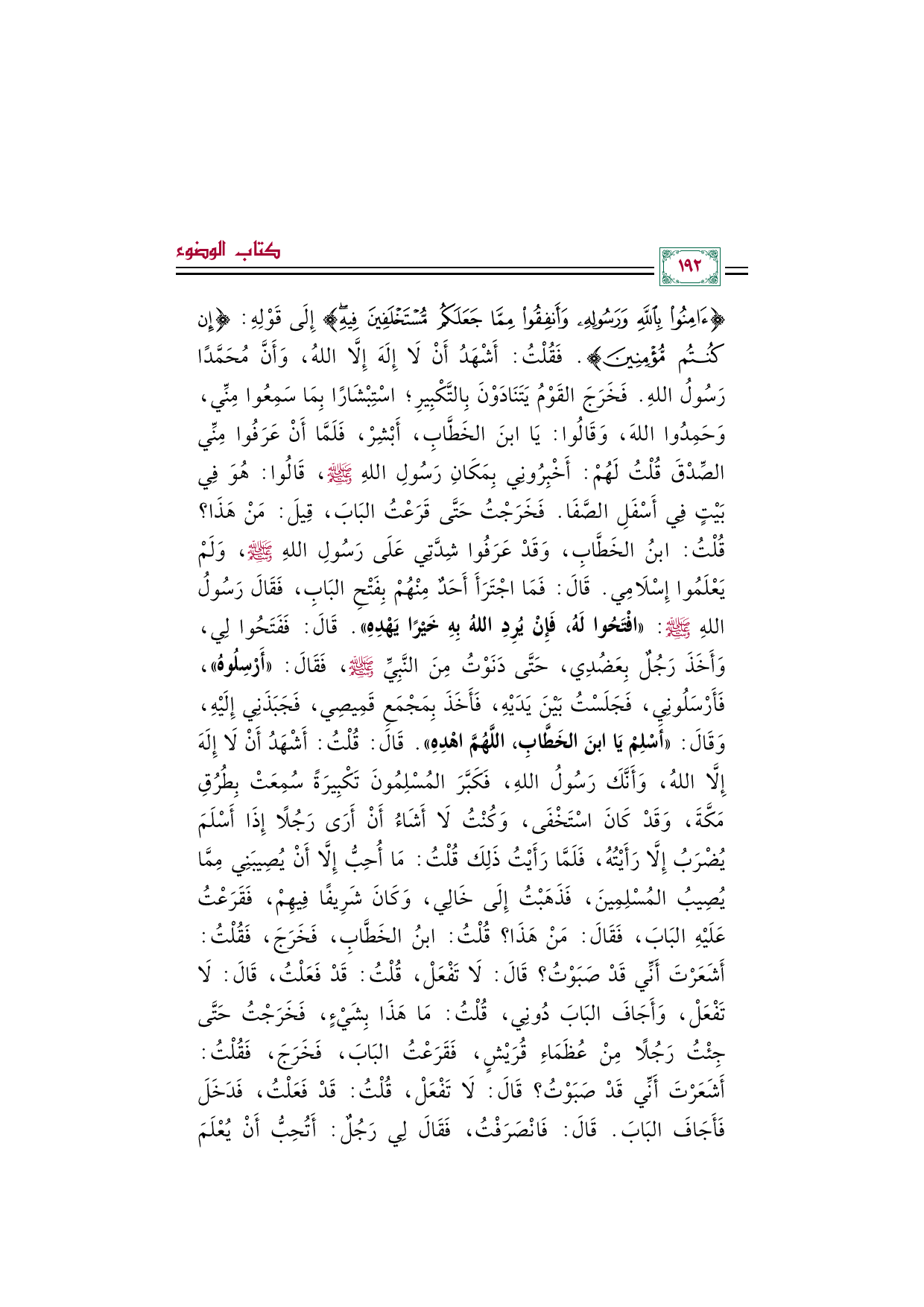 {آمِنُوا بِاللَّهِ وَرَسُولِهِ وَأَنْفِقُوا مِمَّا جَعَلَكُمْ مُسْتَخْلَفِينَ فِيهِ} إِلَى قَوْلِهِ: {إِنْ كُنْتُمْ مُؤْمِنِينَ}. فَقُلْتُ: أَشْهَدُ أَنْ لَا إِلَهَ إِلَّا اللهُ، وَأَنَّ مُحَمَّدًا رَسُولُ اللهِ. فَخَرَجَ القَوْمُ يَتَنَادَوْنَ بِالتَّكْبِيرِ؛ اسْتِبْشَارًا بِمَا سَمِعُوا مِنِّي، وَحَمِدُوا اللهَ، وَقَالُوا: يَا ابنَ الخَطَّابِ، أَبْشِرْ، فَلَمَّا أَنْ عَرَفُوا مِنِّي الصِّدْقَ قُلْتُ لَهُمْ: أَخْبِرُونِي بِمَكَانِ رَسُولِ اللهِ صلى الله عليه وسلم، قَالُوا: هُوَ فِي بَيْتٍ فِي أَسْفَلِ الصَّفَا. فَخَرَجْتُ حَتَّى قَرَعْتُ البَابَ، قِيلَ: مَنْ هَذَا؟ قُلْتُ: ابنُ الخَطَّابِ، وَقَدْ عَرَفُوا شِدَّتِي عَلَى رَسُولِ اللهِ صلى الله عليه وسلم، وَلَمْ يَعْلَمُوا إِسْلَامِي. قَالَ: فَمَا اجْتَرَأَ أَحَدٌ مِنْهُمْ بِفَتْحِ البَابِ، فَقَالَ رَسُولُ اللهِ صلى الله عليه وسلم: ((افْتَحُوا لَهُ، فَإِنْ يُرِدِ اللهُ بِهِ خَيْرًا يَهْدِهِ)). قَالَ: فَفَتَحُوا لِي، وَأَخَذَ رَجُلٌ بِعَضُدِي، حَتَّى دَنَوْتُ مِنَ النَّبِيِّ صلى الله عليه وسلم، فَقَالَ: ((أَرْسِلُوهُ))، فَأَرْسَلُونِي، فَجَلَسْتُ بَيْنَ يَدَيْهِ، فَأَخَذَ بِمَجْمَعِ قَمِيصِي، فَجَبَذَنِي إِلَيْهِ، وَقَالَ: ((أَسْلِمْ يَا ابنَ الخَطَّابِ، اللَّهُمَّ اهْدِهِ)).