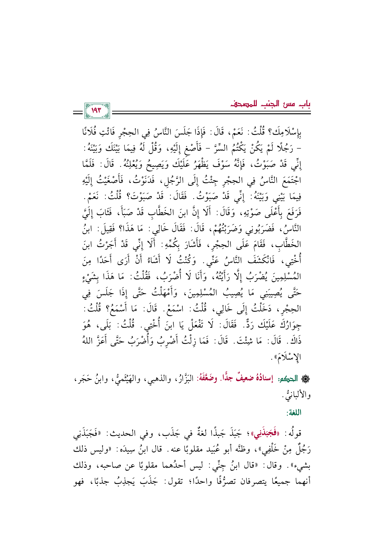قولُه: ((فَجَبَذَنِي))؛ جَبَذَ جَبذًا لغةٌ في جَذَب، وفي الحديث: ((فَجَبَذَنِي رَجُلٌ مِنْ خَلْفِي))، وظنَّه أبو عُبَيد مقلوبًا عنه. قال ابنُ سِيدَه: ((وليس ذلك بشيء)). وقال: ((قال ابنُ جِنِّي: ليس أحدُهما مقلوبًا عن صاحبه، وذلك أنهما جميعًا يتصرفان تصرُّفًا واحدًا؛ تقول: جَذَبَ يَجذِبُ جذبًا، فهو