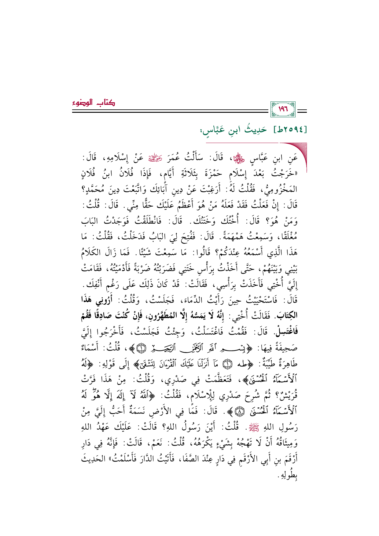 ◼ عَنِ ابنِ عَبَّاسٍ رضي الله عنهما، قَالَ: سَأَلْتُ عُمَرَ رضي الله عنه عَنْ إِسْلَامِهِ، قَالَ: ((خَرَجْتُ بَعْدَ إِسْلَامِ حَمْزَةَ بِثَلَاثَةِ أَيَّامٍ، فَإِذَا فُلَانُ ابنُ فُلَانٍ المَخْزُومِيُّ، فَقُلْتُ لَهُ: أَرَغِبْتَ عَنْ دِينِ آبَائِكَ وَاتَّبَعْتَ دِينَ مُحَمَّدٍ؟ قَالَ: إِنْ فَعَلْتُ فَقَدْ فَعَلَهُ مَنْ هُوَ أَعْظَمُ عَلَيْكَ حَقًّا مِنِّي. قَالَ: قُلْتُ: وَمَنْ هُوَ؟ قَالَ: أُخْتُكَ وَخَتَنُكَ. قَالَ: فَانْطَلَقْتُ فَوَجَدْتُ البَابَ مُغْلَقًا، وَسَمِعْتُ هَمْهَمَةً. قَالَ: فَفُتِحَ لِيَ البَابُ فَدَخَلْتُ، فَقُلْتُ: مَا هَذَا الَّذِي أَسْمَعُهُ عِنْدَكُمْ؟ قَالُوا: مَا سَمِعْتَ شَيْئًا. فَمَا زَالَ الكَلَامُ بَيْنِي وَبَيْنَهُمْ، حَتَّى أَخَذْتُ بِرَأْسِ خَتَنِي فَضَرَبْتُهُ ضَرْبَةً فَأَدْمَيْتُهُ، فَقَامَتْ إِلَيَّ أُخْتِي فَأَخَذَتْ بِرَأْسِي، فَقَالَتْ: قَدْ كَانَ ذَلِكَ عَلَى رَغْمِ أَنْفِكَ. قَالَ: فَاسْتَحْيَيْتُ حِينَ رَأَيْتُ الدِّمَاءَ، فَجَلَسْتُ، وَقُلْتُ: أَرُونِي هَذَا الكِتَابَ. فَقَالَتْ أُخْتِي: إِنَّهُ لَا يَمَسُّهُ إِلَّا المُطَهَّرُونِ، فَإِنْ كُنْتَ صَادِقًا فَقُمْ فَاغْتَسِلْ.