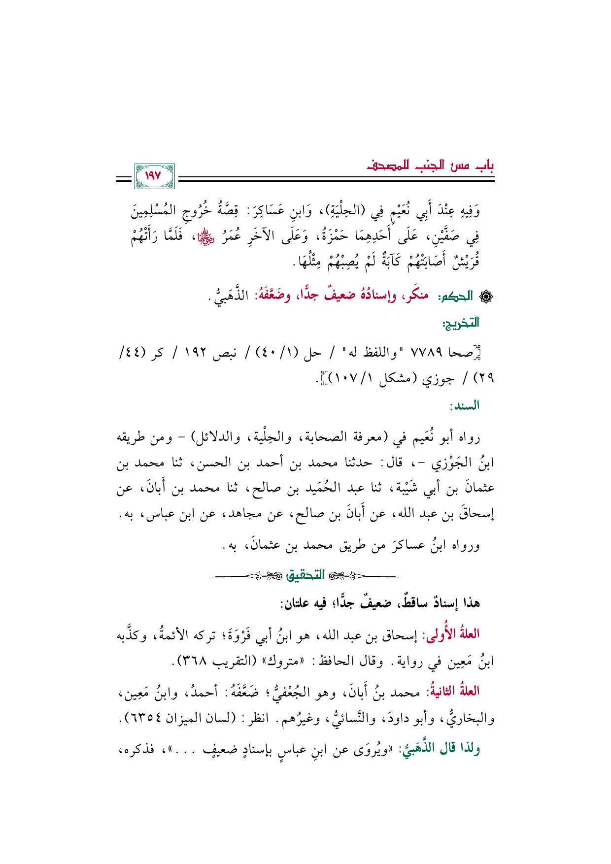 رواه أبو نُعَيم في (معرفة الصحابة، والحِلْية، والدلائل) -ومن طريقه ابنُ الجَوْزي-، قال: حدثنا محمد بن أحمد بن الحسن، ثنا محمد بن عثمانَ بن أبي شَيْبة، ثنا عبد الحُمَيد بن صالح، ثنا محمد بن أَبانَ، عن إسحاقَ بن عبد الله، عن أَبانَ بن صالح، عن مجاهد، عن ابن عباس، به.