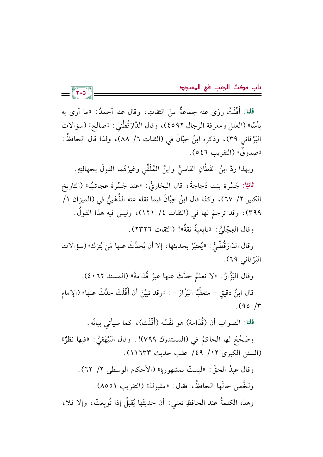 ثانيًا: جَسْرة بنت دَجاجةَ؛ قال البخاريُّ: "عند جَسْرةَ عجائبُ" (التاريخ الكبير ٢/ ٦٧)، وكذا قال ابنُ حِبَّانَ فيما نقله عنه الذَّهَبيُّ في (الميزان ١/ ٣٩٩)، وقد ترجمَ لها في (الثقات ٤/ ١٢١)، وليس فيه هذا القولُ.