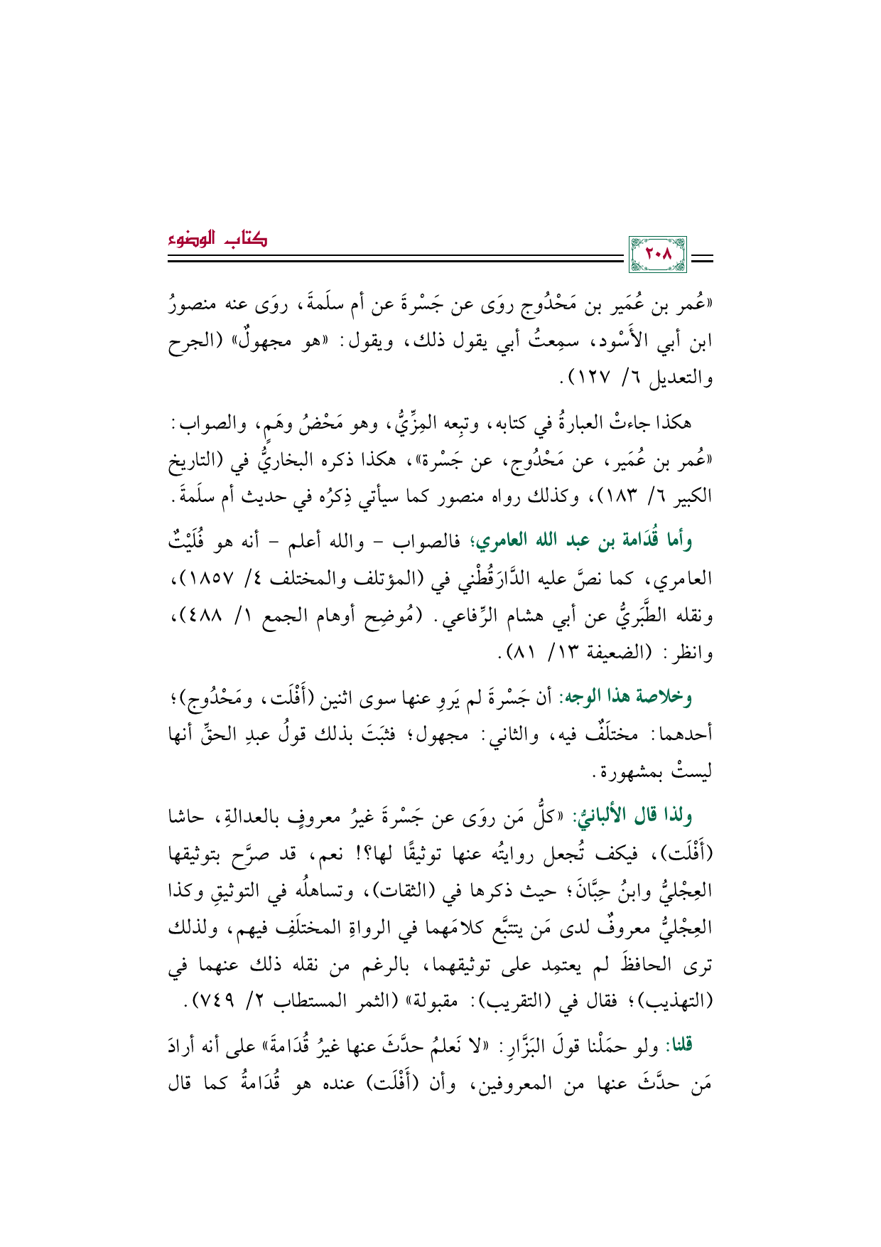 ولذا قال الألبانيُّ: ((كلُّ مَن روَى عن جَسْرةَ غيرُ معروفٍ بالعدالةِ، حاشا (أَفْلَت)، فيكف تُجعل روايتُه عنها توثيقًا لها؟ ! نعم، قد صرَّح بتوثيقها العِجْليُّ وابنُ حِبَّانَ؛ حيث ذكرها في (الثقات)، وتساهلُه في التوثيقِ وكذا العِجْليُّ معروفٌ لدى مَن يتتبَّع كلامَهما في الرواةِ المختلَفِ فيهم، ولذلك ترى الحافظَ لم يعتمِد على توثيقهما، بالرغم من نقله ذلك عنهما في (التهذيب)؛ فقال في (التقريب): مقبولة)) (الثمر المستطاب ٢/ ٧٤٩).