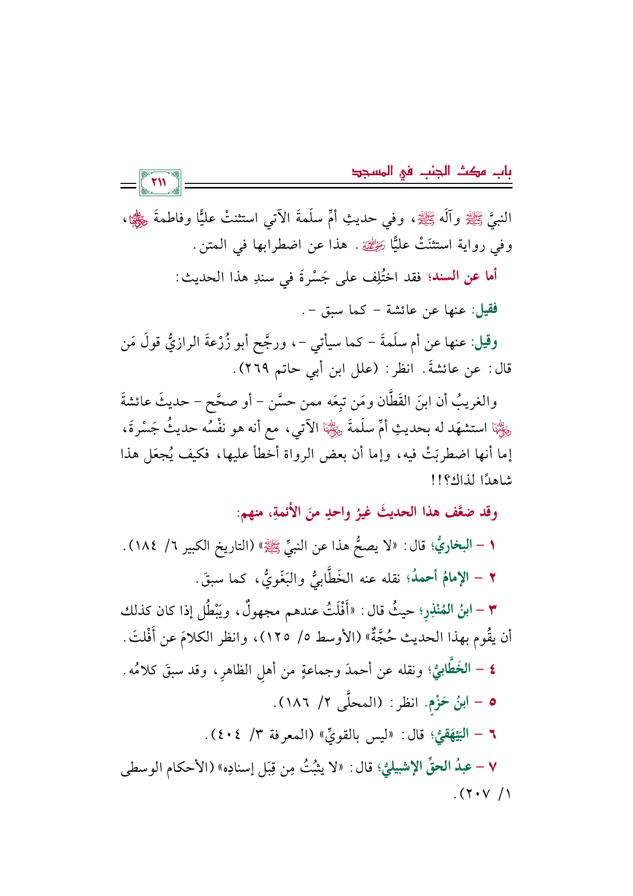 والغريبُ أن ابنَ القَطَّان ومَن تبِعَه ممن حسَّن -أو صحَّح- حديثَ عائشةَ رضي الله عنها استشهَد له بحديثِ أمِّ سلَمةَ رضي الله عنها الآتي، مع أنه هو نفْسُه حديثُ جَسْرةَ، إما أنها اضطربَتْ فيه، وإما أن بعض الرواة أخطأ عليها، فكيف يُجعَل هذا شاهدًا لذاك؟ ! !