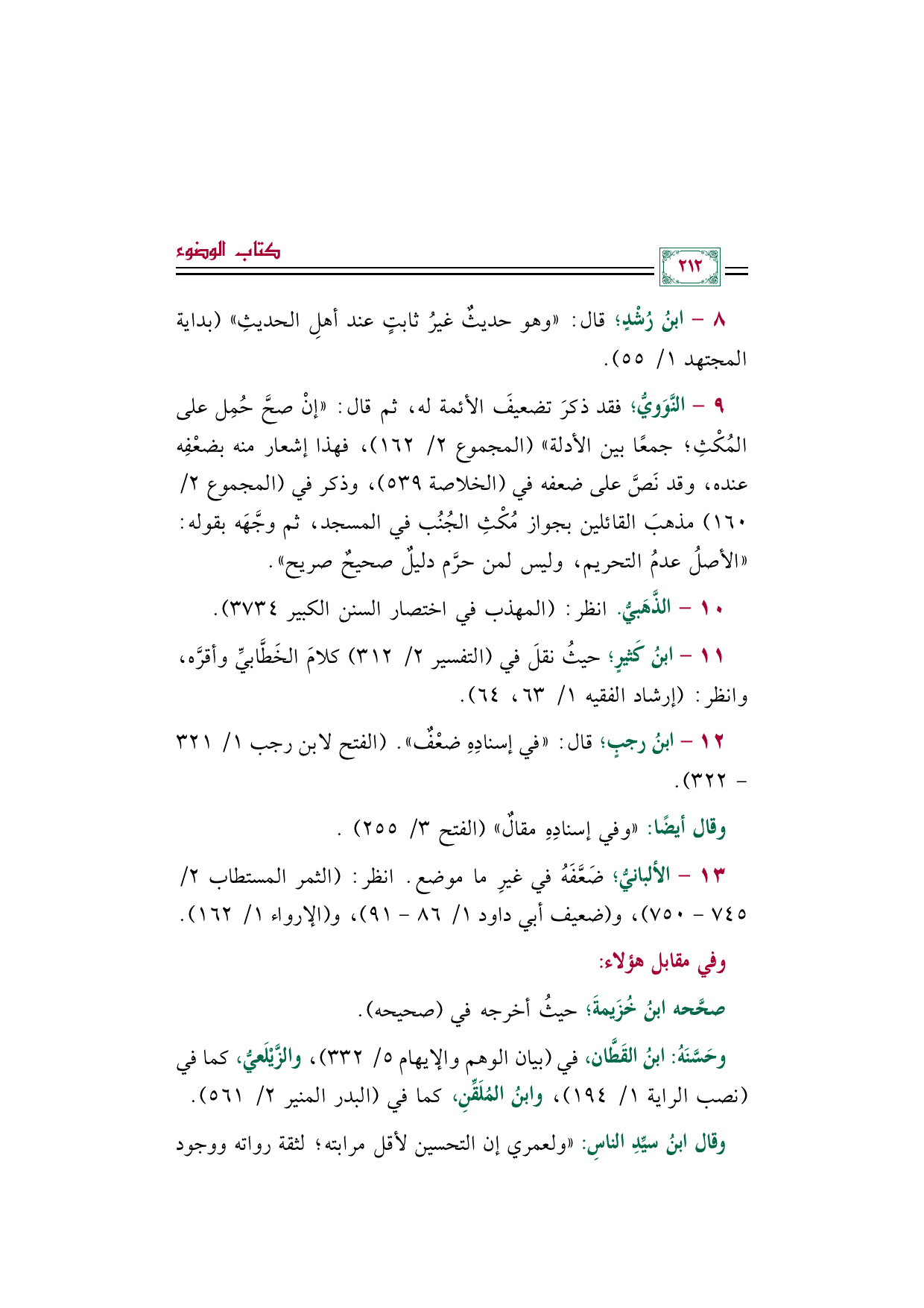 ٨ - ابنُ رُشْدٍ؛ قال: "وهو حديثٌ غيرُ ثابتٍ عند أهلِ الحديثِ" (بداية المجتهد ١/ ٥٥).