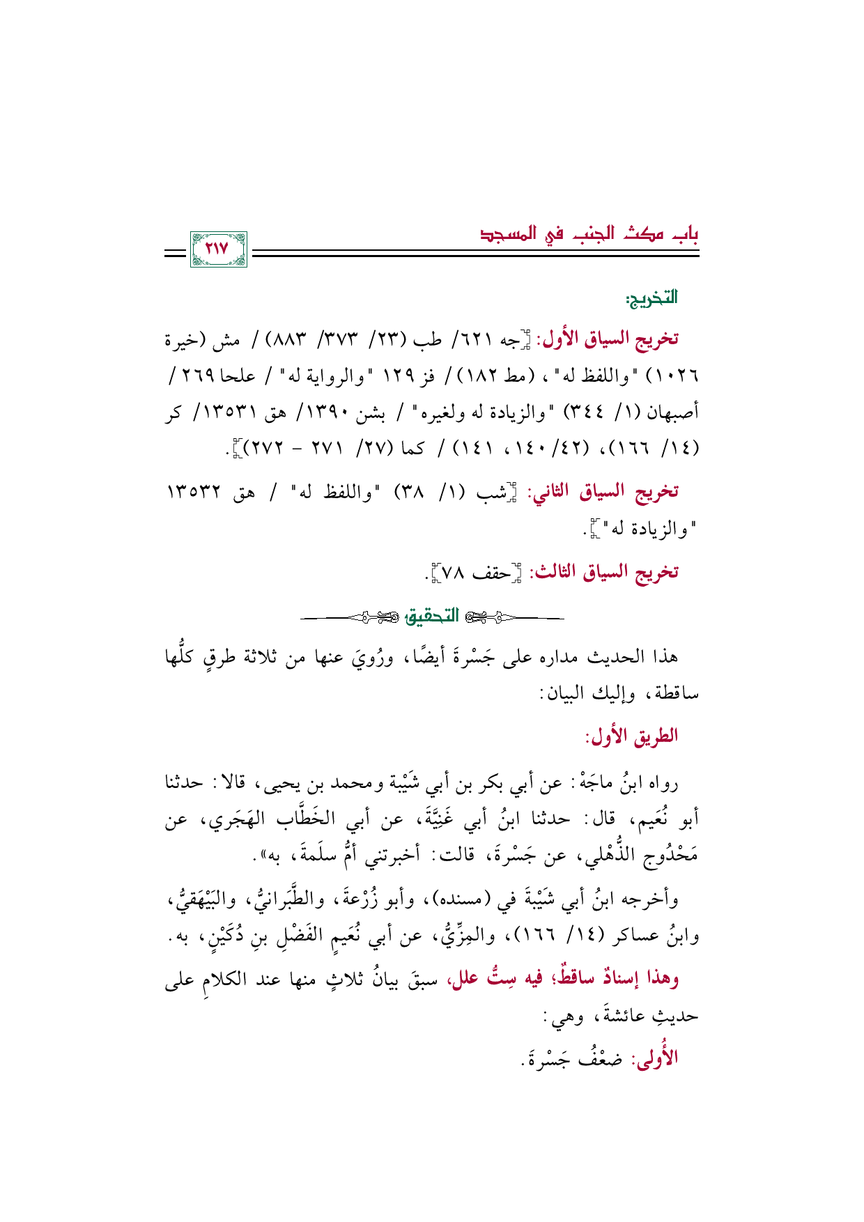 رواه ابنُ ماجَهْ: عن أبي بكر بن أبي شَيْبة ومحمد بن يحيى، قالا: حدثنا أبو نُعَيم، قال: حدثنا ابنُ أبي غَنِيَّةَ، عن أبي الخَطَّاب الهَجَري، عن مَحْدُوج الذُّهْلي، عن جَسْرةَ، قالت: أخبرتني أمُّ سلَمةَ، به".