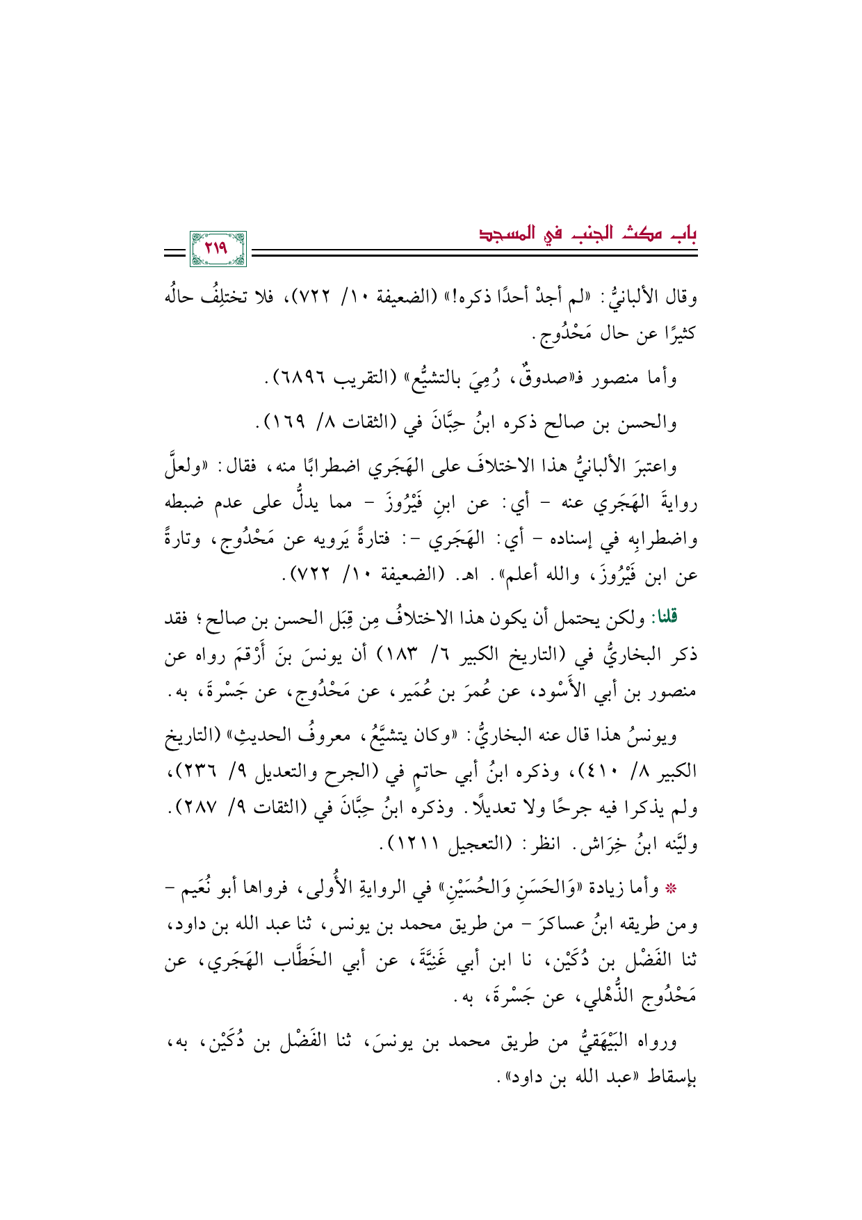 قلنا: ولكن يحتمل أن يكون هذا الاختلافُ مِن قِبَل الحسن بن صالح؛ فقد ذكر البخاريُّ في (التاريخ الكبير ٦/ ١٨٣) أن يونسَ بنَ أَرْقمَ رواه عن منصور بن أبي الأَسْود، عن عُمرَ بن عُمَير، عن مَحْدُوج، عن جَسْرةَ، به.