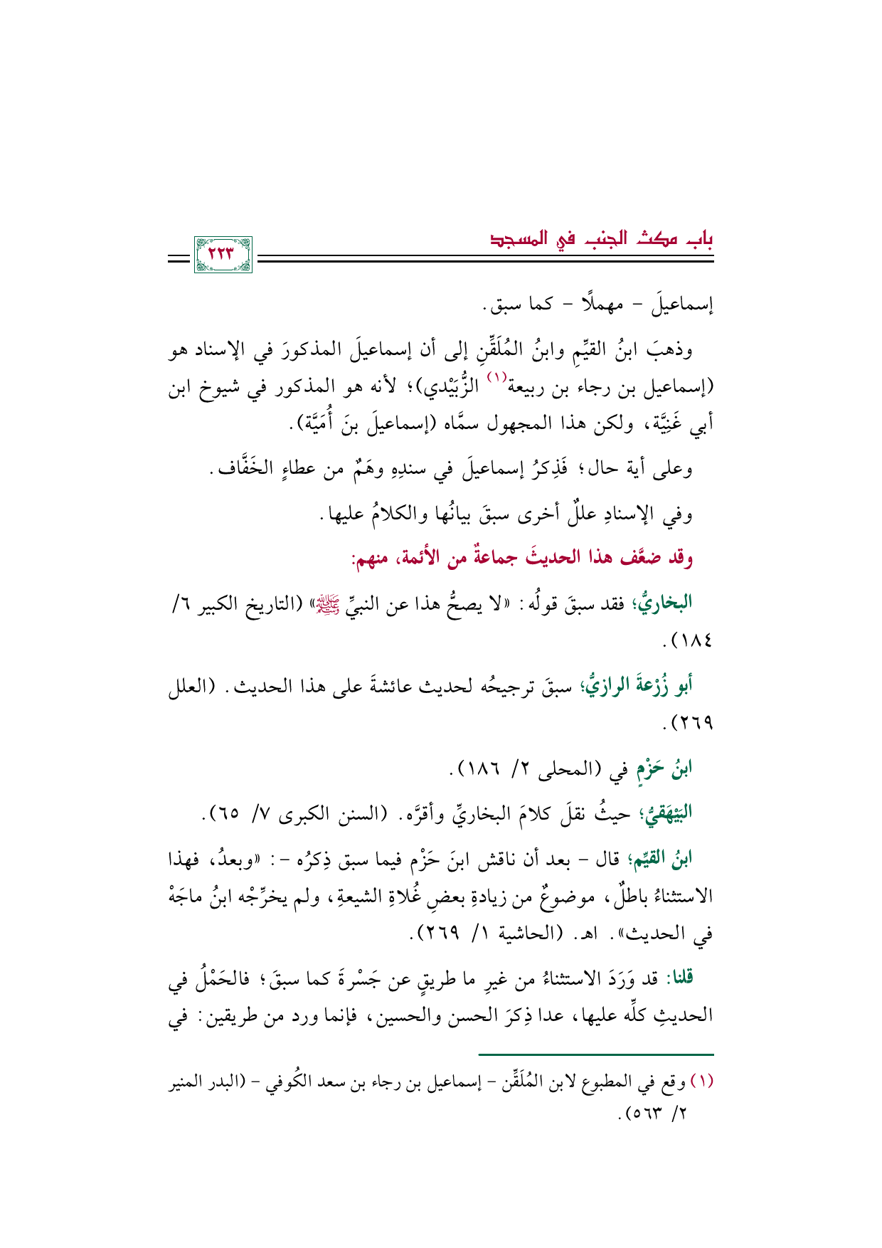 (¬١) وقع في المطبوع لابن المُلَقِّن -إسماعيل بن رجاء بن سعد الكُوفي- (البدر المنير ٢/ ٥٦٣).