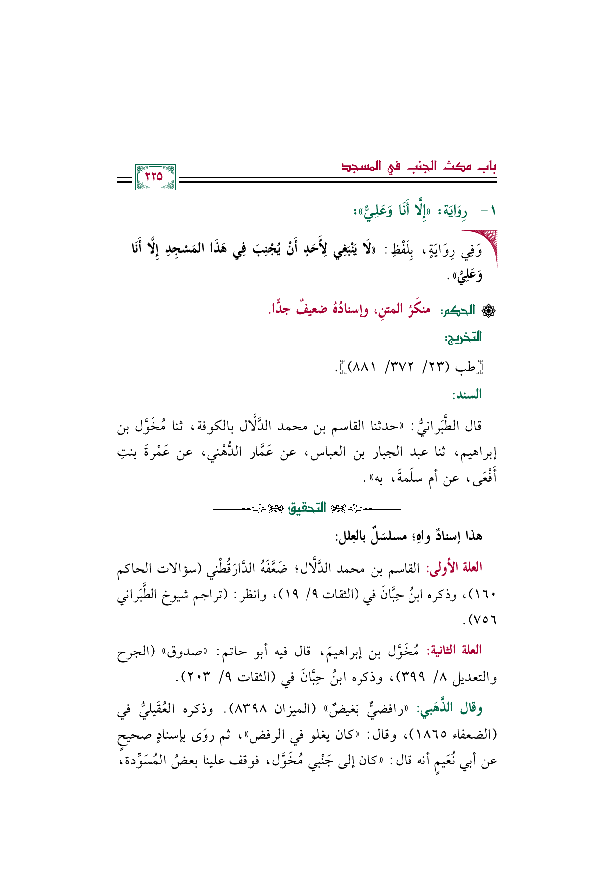 العلة الأولى: القاسم بن محمد الدَّلَّال؛ ضَعَّفَهُ الدَّارَقُطْني (سؤالات الحاكم ١٦٠)، وذكره ابنُ حِبَّانَ في (الثقات ٩/ ١٩)، وانظر: (تراجم شيوخ الطَّبَراني ٧٥٦).