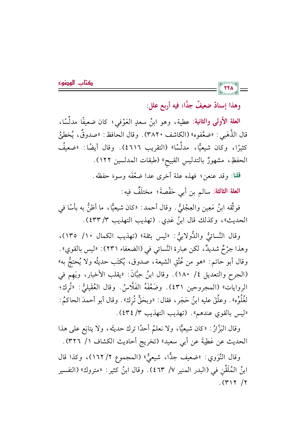 العلة الأولى والثانية: عطية، وهو ابنُ سعدٍ العَوْفي؛ كان ضعيفًا مدلِّسًا، قال الذَّهَبي: "ضعَّفوه" (الكاشف ٣٨٢٠). وقال الحافظ: "صدوقٌ، يُخطئُ كثيرًا، وكان شيعيًّا، مدلِّسًا" (التقريب ٤٦١٦). وقال أيضًا: "ضعيفُ الحفظِ، مشهورٌ بالتدليسِ القبيحِ" (طبقات المدلسين ١٢٢).