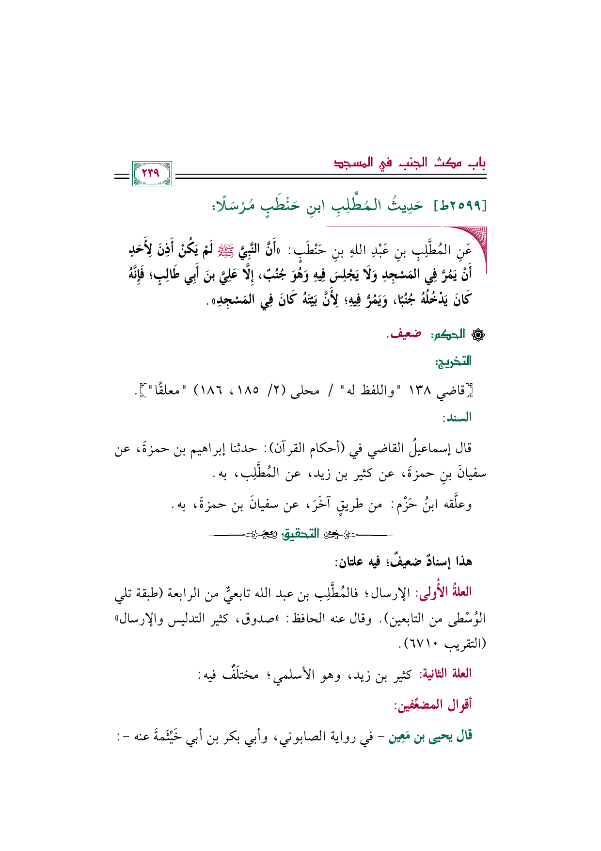 العلةُ الأُولى: الإرسال؛ فالمُطَّلِب بن عبد الله تابعيٌّ من الرابعة (طبقة تلي الوُسْطى من التابعين). وقال عنه الحافظ: "صدوق، كثير التدليس والإرسال" (التقريب ٦٧١٠).