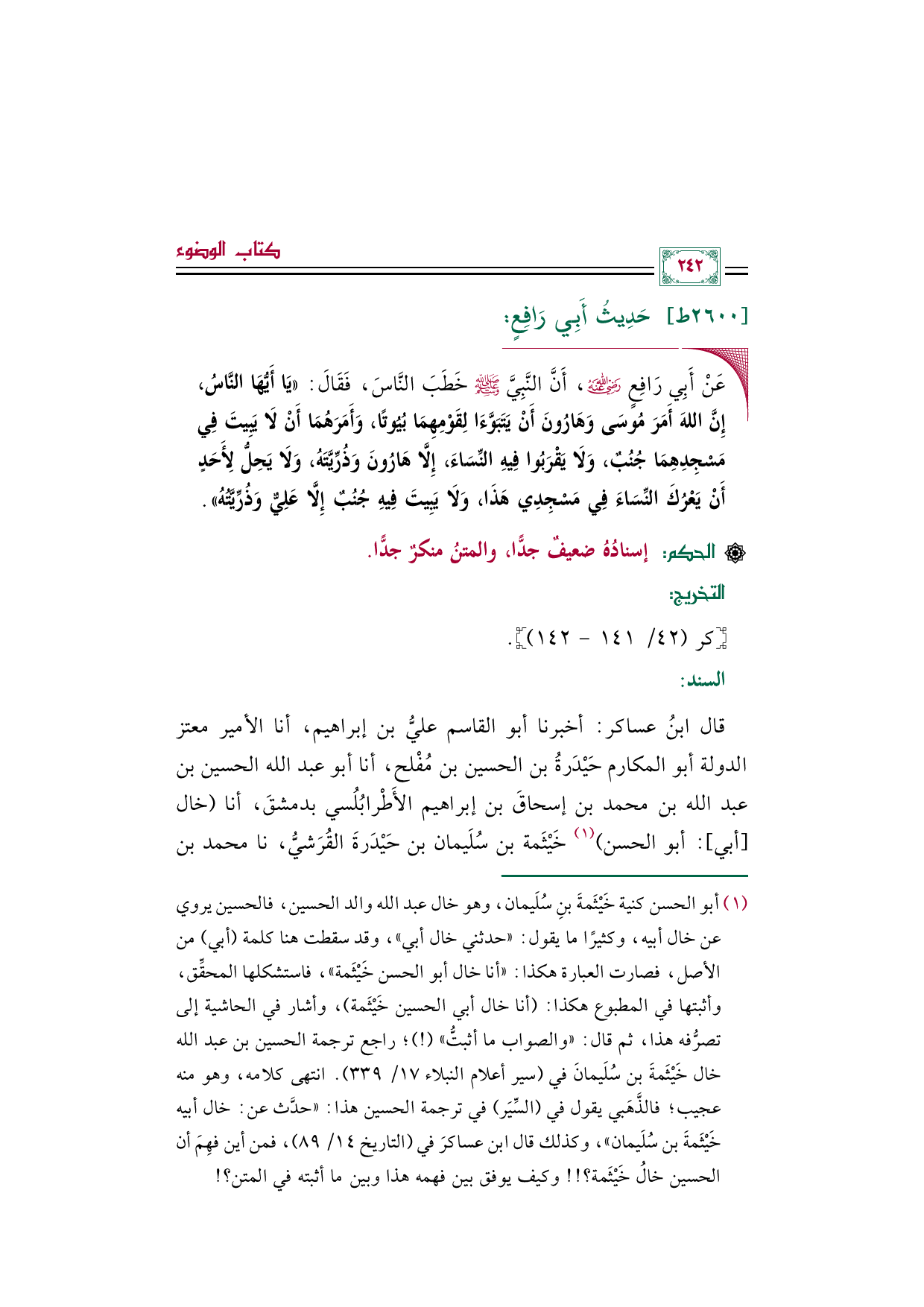 (¬١) أبو الحسن كنية خَيْثَمةَ بنِ سُلَيمان، وهو خال عبد الله والد الحسين، فالحسين يروي عن خال أبيه، وكثيرًا ما يقول: "حدثني خال أبي"، وقد سقطت هنا كلمة (أبي) من الأصل، فصارت العبارة هكذا: "أنا خال أبو الحسن خَيْثَمة"، فاستشكلها المحقِّق، وأثبتها في المطبوع هكذا: (أنا خال أبي الحسين خَيْثَمة)، وأشار في الحاشية إلى تصرُّفه هذا، ثم قال: "والصواب ما أثبتُّ" (! )؛ راجع ترجمة الحسين بن عبد الله خال خَيْثَمةَ بن سُلَيمانَ في (سير أعلام النبلاء ١٧/ ٣٣٩). انتهى كلامه، وهو منه عجيب؛ فالذَّهَبي يقول في (السِّيَر) في ترجمة الحسين هذا: "حدَّث عن: خال أبيه خَيْثَمةَ بن سُلَيمان"، وكذلك قال ابن عساكرَ في (التاريخ ١٤/ ٨٩)، فمن أين فهِمَ أن الحسين خالُ خَيْثَمة؟ ! ! وكيف يوفق بين فهمه هذا وبين ما أثبته في المتن؟ !