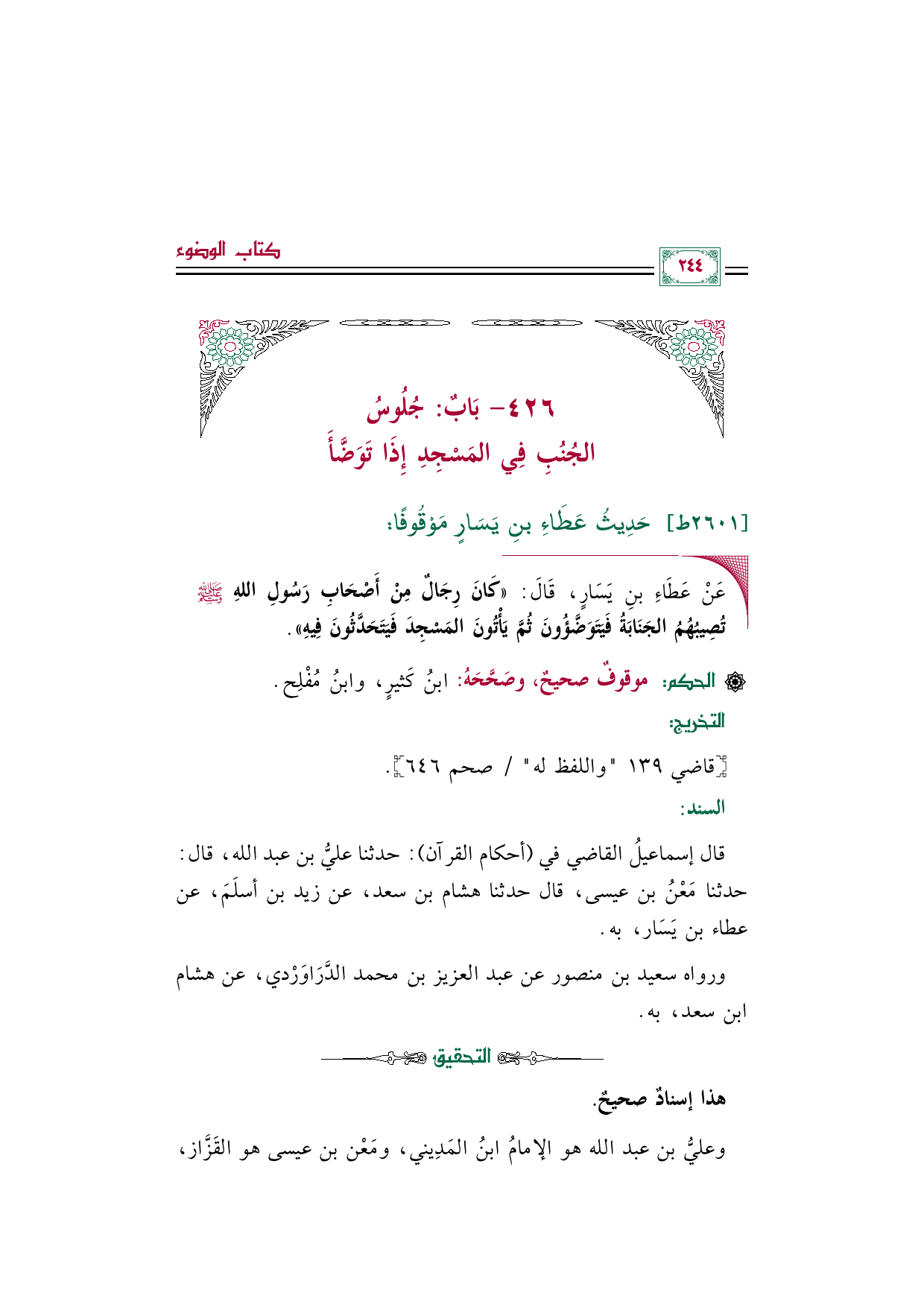 قال إسماعيلُ القاضي في (أحكام القرآن): حدثنا عليُّ بن عبد الله، قال: حدثنا مَعْنُ بن عيسى، قال حدثنا هشام بن سعد، عن زيد بن أسلَمَ، عن عطاء بن يَسَار، به.
