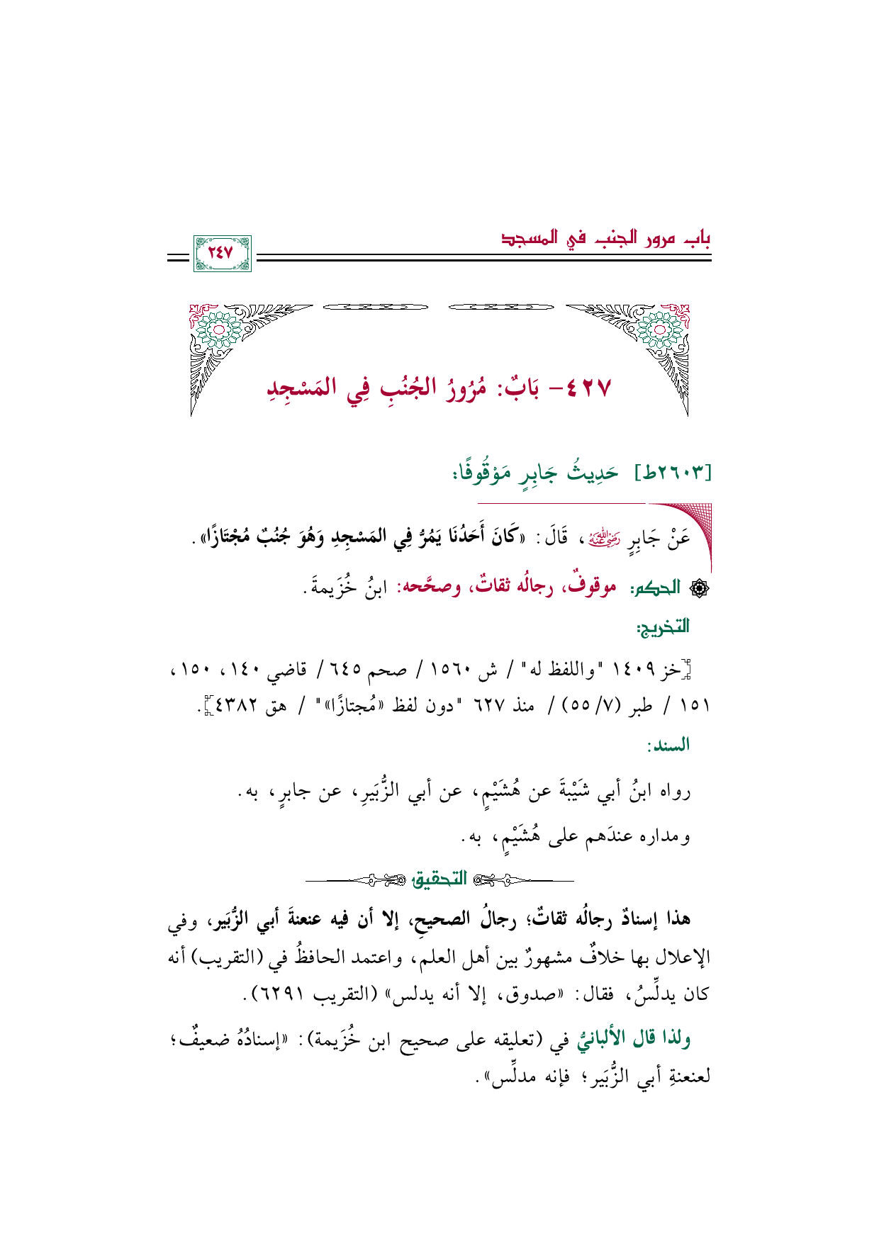 ولذا قال الألبانيُّ في (تعليقه على صحيح ابن خُزَيمة): "إسنادُهُ ضعيفٌ؛ لعنعنةِ أبي الزُّبَير؛ فإنه مدلِّس".