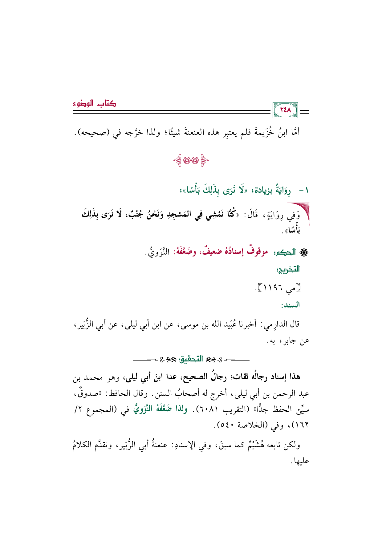 هذا إسناد رجالُه ثقات؛ رجالُ الصحيح، عدا ابنَ أبي ليلى، وهو محمد بن عبد الرحمن بن أبي ليلى، أخرج له أصحابُ السنن. وقال الحافظ: "صدوقٌ، سيِّئ الحفظ جدًّا" (التقريب ٦٠٨١). ولذا ضَعَّفَهُ النَّوَويُّ في (المجموع ٢/ ١٦٢)، وفي (الخلاصة ٥٤٠).