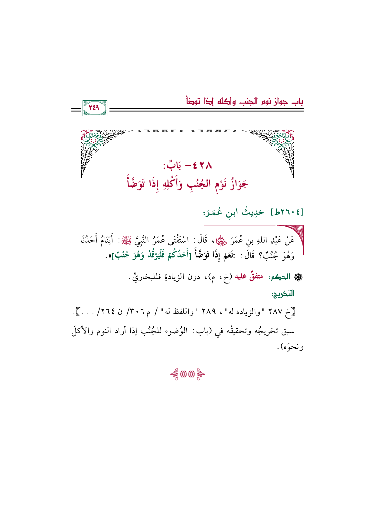◼ عَنْ عَبْدِ اللهِ بنِ عُمَرَ رضي الله عنهما، قَالَ: اسْتَفْتَى عُمَرُ النَّبِيَّ صلى الله عليه وسلم: أَيَنَامُ أَحَدُنَا وَهُوَ جُنُبٌ؟ قَالَ: ((نَعَمْ إِذَا تَوَضَّأَ [أَحَدُكُمْ فَلْيَرْقُدْ وَهُوَ جُنُبٌ])).