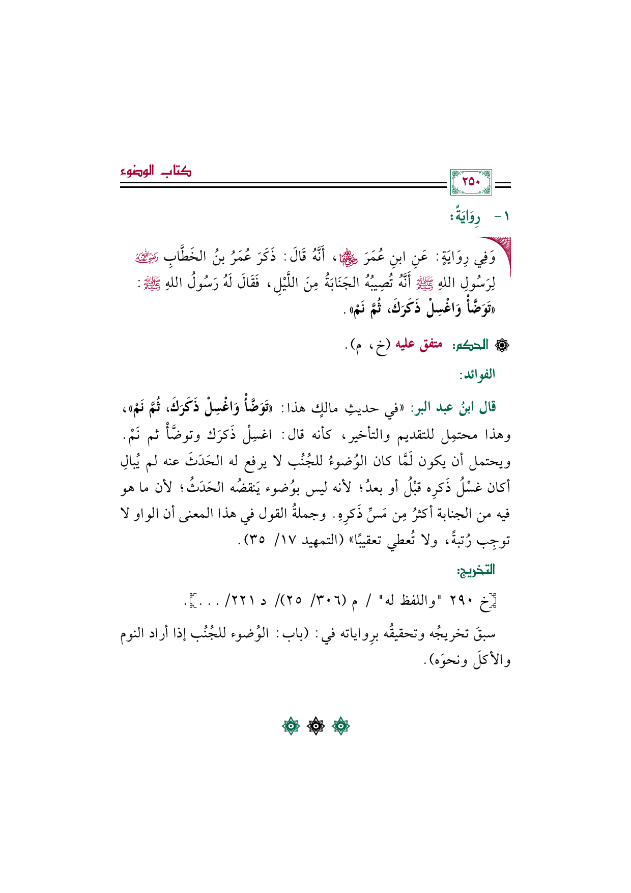 • وَفِي رِوَايَةٍ: عَنِ ابنِ عُمَرَ رضي الله عنهما، أَنَّهُ قَالَ: ذَكَرَ عُمَرُ بنُ الخَطَّابِ رضي الله عنه لِرَسُولِ اللهِ صلى الله عليه وسلم أَنَّهُ تُصِيبُهُ الجَنَابَةُ مِنَ اللَّيْلِ، فَقَالَ لَهُ رَسُولُ اللهِ صلى الله عليه وسلم: ((تَوَضَّأْ وَاغْسِلْ ذَكَرَكَ، ثُمَّ نَمْ)).
