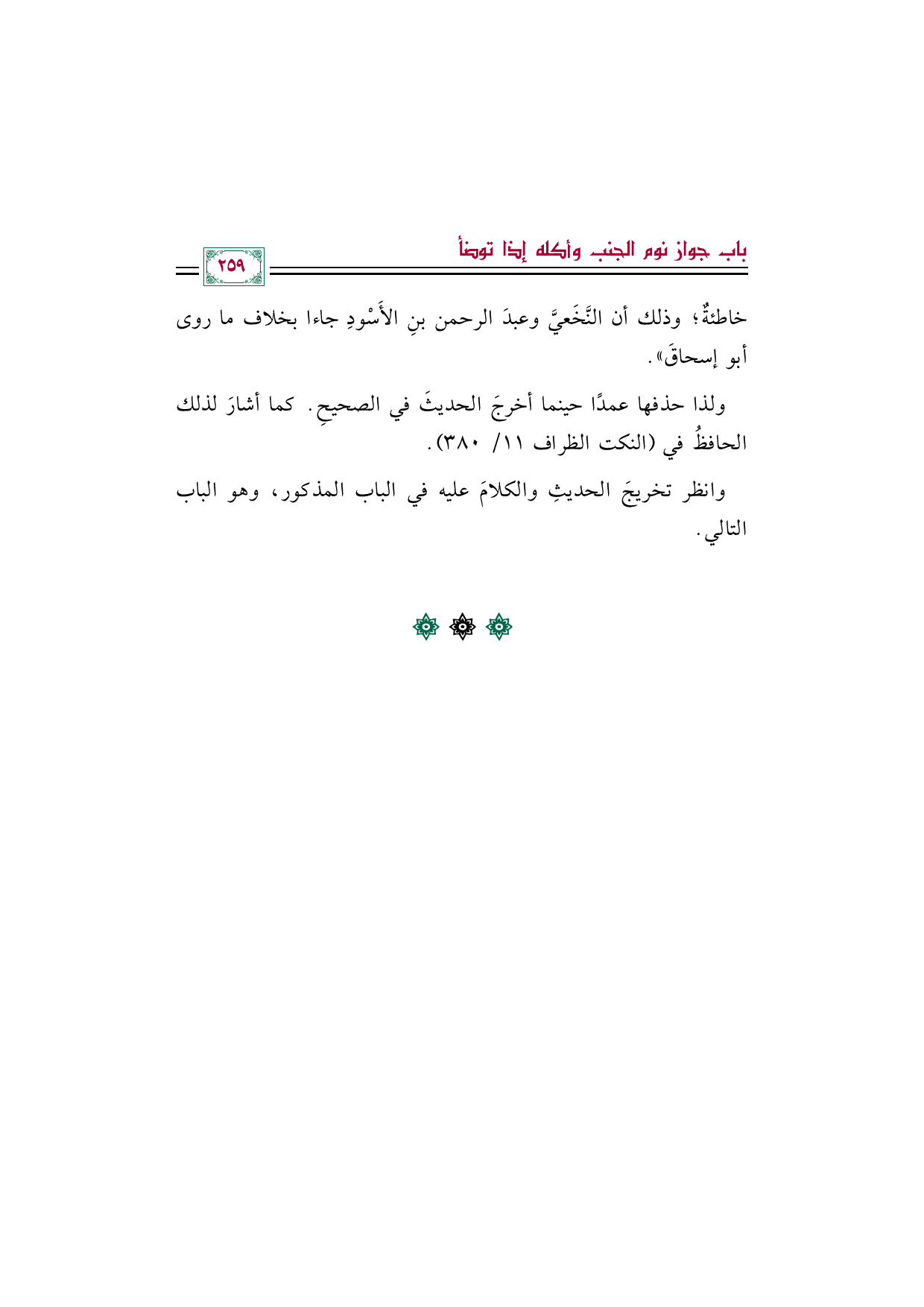 ولذا حذفها عمدًا حينما أخرجَ الحديثَ في الصحيحِ. كما أشارَ لذلك الحافظُ في (النكت الظراف ١١/ ٣٨٠).