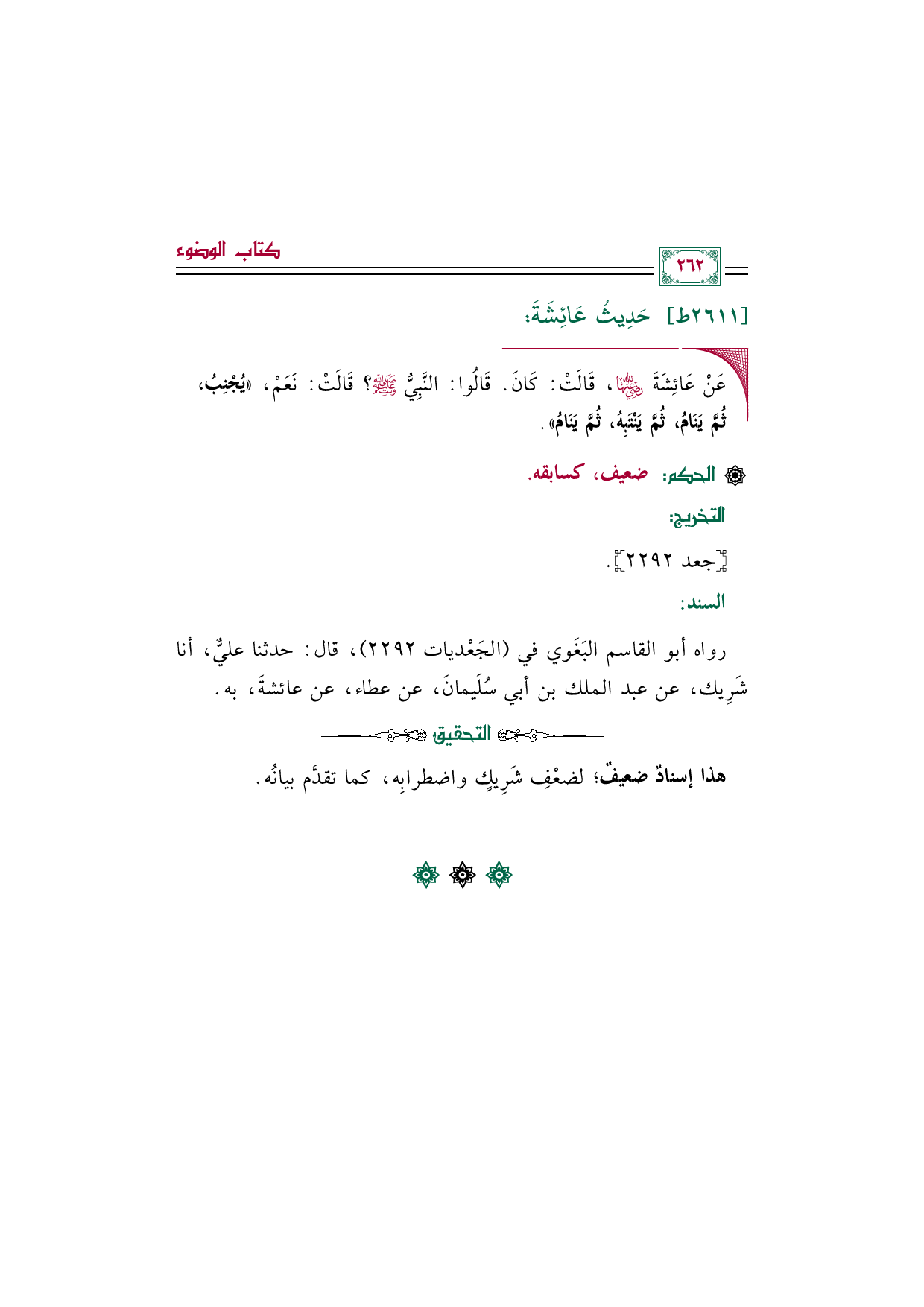 رواه أبو القاسم البَغَوي في (الجَعْديات ٢٢٩٢)، قال: حدثنا عليٌّ، أنا شَرِيك، عن عبد الملك بن أبي سُلَيمانَ، عن عطاء، عن عائشةَ، به.