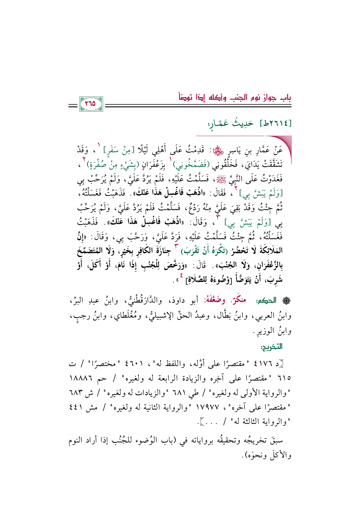 ◼ عَنْ عَمَّارِ بنِ يَاسِرٍ رضي الله عنهما: قَدِمْتُ عَلَى أَهْلِي لَيْلًا [مِنْ سَفَرٍ] ١، وَقَدْ تَشَقَّقَتْ يَدَايَ، فَخَلَّقُونِي (فَضَمَّخُونِي) ١ بِزَعْفَرَانٍ (بِشَيْءٍ مِنْ صُفْرَةٍ) ٢، فَغَدَوْتُ عَلَى النَّبِيِّ صلى الله عليه وسلم، فَسَلَّمْتُ عَلَيْهِ، فَلَمْ يَرُدَّ عَلَيَّ، وَلَمْ يُرَحِّبْ بِي [وَلَمْ يَبَشَّ بِي] ٢، فَقَالَ: ((اذْهَبْ فَاغْسِلْ هَذَا عَنْكَ)). فَذَهَبْتُ فَغَسَلْتُهُ، ثُمَّ جِئْتُ وَقَدْ بَقِيَ عَلَيَّ مِنْهُ رَدْعٌ، فَسَلَّمْتُ فَلَمْ يَرُدَّ عَلَيَّ، وَلَمْ يُرَحِّبْ بِي [وَلَمْ يَبَشَّ بِي] ٣، وَقَالَ: ((اذْهَبْ فَاغْسِلْ هَذَا عَنْكَ)). فَذَهَبْتُ فَغَسَلْتُهُ، ثُمَّ جِئْتُ فَسَلَّمْتُ عَلَيْهِ، فَرَدَّ عَلَيَّ، وَرَحَّبَ بِي، وَقَالَ: ((إِنَّ المَلَائِكَةَ لَا تَحْضُرُ (تَكْرَهُ أَنْ تَقْرَبَ) ٣ جِنَازَةَ الكَافِرِ بِخَيْرٍ، وَلَا المُتَضَمِّخَ بِالزَّعْفَرَانِ، وَلَا الجُنُبَ)). قَالَ: ((وَرَخَّصَ لِلْجُنُبِ إِذَا نَامَ، أَوْ أَكَلَ، أَوْ شَرِبَ، أَنْ يَتَوَضَّأَ] وُضُوءَهُ لِلصَّلَاةِ [٤)).