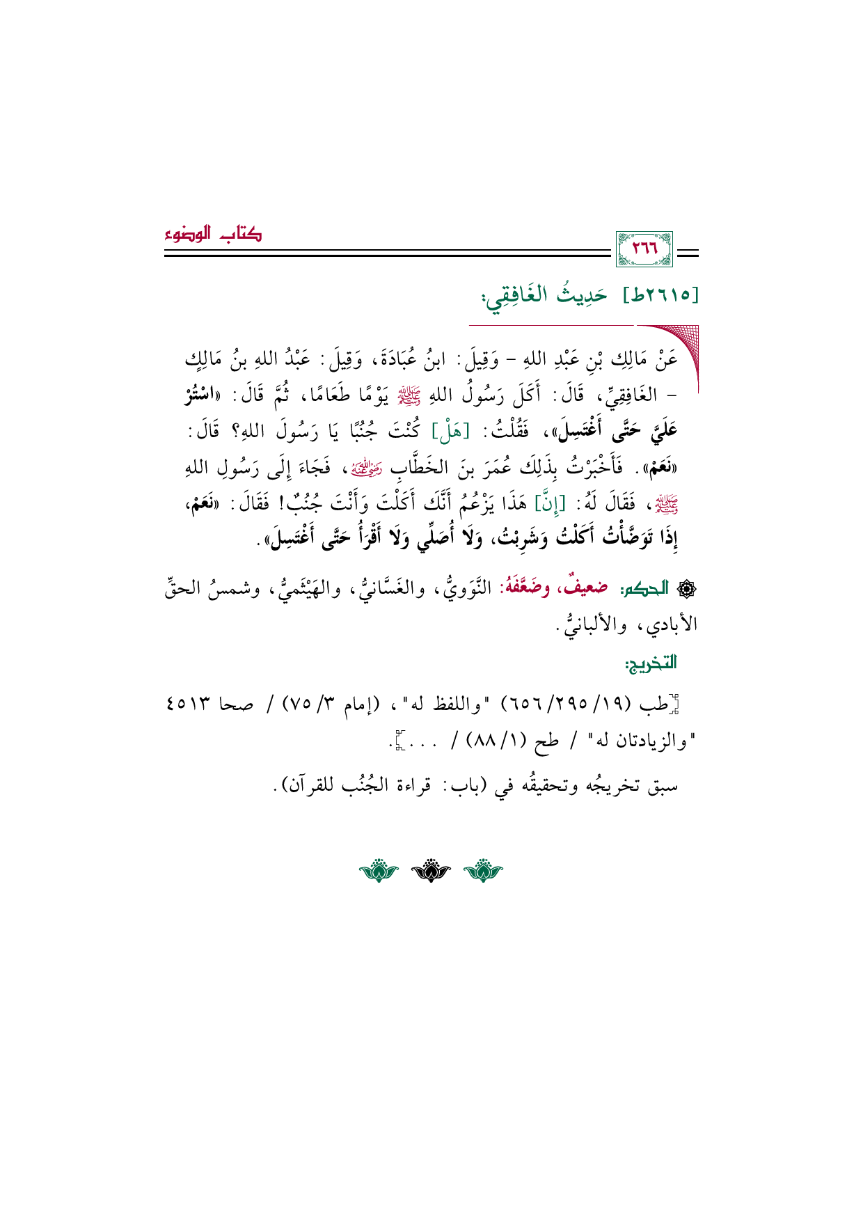 ◼ عَنْ مَالِكِ بْنِ عَبْدِ اللهِ -وَقِيلَ: ابنُ عُبَادَةَ، وَقِيلَ: عَبْدُ اللهِ بنُ مَالِكٍ- الغَافِقِيِّ، قَالَ: أَكَلَ رَسُولُ اللهِ صلى الله عليه وسلم يَوْمًا طَعَامًا، ثُمَّ قَالَ: ((اسْتُرْ عَلَيَّ حَتَّى أَغْتَسِلَ))، فَقُلْتُ: [هَلْ] كُنْتَ جُنُبًا يَا رَسُولَ اللهِ؟ قَالَ: ((نَعَمْ)). فَأَخْبَرْتُ بِذَلِكَ عُمَرَ بنَ الخَطَّابِ رضي الله عنه، فَجَاءَ إِلَى رَسُولِ اللهِ صلى الله عليه وسلم، فَقَالَ لَهُ: [إِنَّ] هَذَا يَزْعُمُ أَنَّكَ أَكَلْتَ وَأَنْتَ جُنُبٌ! فَقَالَ: ((نَعَمْ، إِذَا تَوَضَّأْتُ أَكَلْتُ وَشَرِبْتُ، وَلَا أُصَلِّي وَلَا أَقْرَأُ حَتَّى أَغْتَسِلَ)).