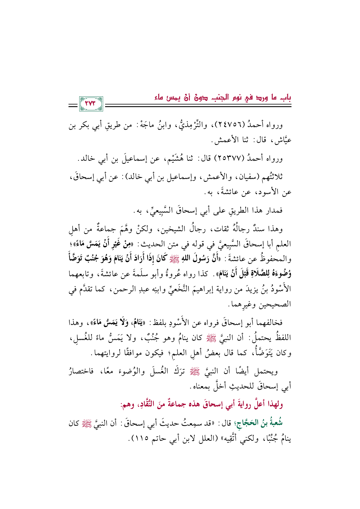 وهذا سندٌ رجالُهُ ثقات، رجالُ الشيخين، ولكنْ وهَّمَ جماعةٌ من أهلِ العلمِ أبا إسحاقَ السَّبِيعيَّ في قوله في متن الحديث: ((مِنْ غَيْرِ أَنْ يَمَسَّ مَاءً))؛ والمحفوظُ عن عائشةَ: ((أَنَّ رَسُولَ اللهِ صلى الله عليه وسلم كَانَ إِذَا أَرَادَ أَنْ يَنَامَ وَهُوَ جُنُبٌ تَوَضَّأَ وُضُوءَهُ لِلصَّلَاةِ قَبْلَ أَنْ يَنَامَ)). كذا رواه عُروةُ وأبو سلَمةَ عن عائشةَ، وتابعهما الأَسْودُ بنُ يزيدَ من رواية إبراهيمَ النَّخَعيِّ وابنِه عبدِ الرحمن، كما تقدَّم في الصحيحين وغيرِهما.