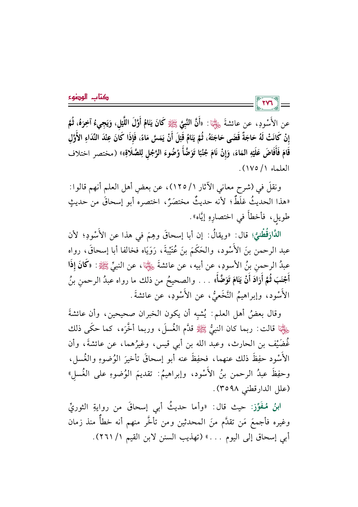 * الدَّارَقُطْنيُّ؛ قال: "ويقالُ: إن أبا إسحاقَ وهِمَ في هذا عن الأَسْودِ؛ لأن عبد الرحمن بنَ الأَسْود، والحَكَمَ بنَ عُتَيْبةَ، رَوَيَاه فخالفا أبا إسحاقَ، رواه عبدُ الرحمنِ بنُ الأسودِ، عن أبيه، عن عائشةَ رضي الله عنها، عن النبيِّ صلى الله عليه وسلم: ((كَانَ إِذَا أَجْنَبَ ثُمَّ أَرَادَ أَنْ يَنَامَ تَوَضَّأَ)) ... والصحيحُ من ذلك ما رواه عبدُ الرحمنِ بنُ الأَسْود، وإبراهيمُ النَّخَعيُّ، عن الأَسْودِ، عن عائشةَ.