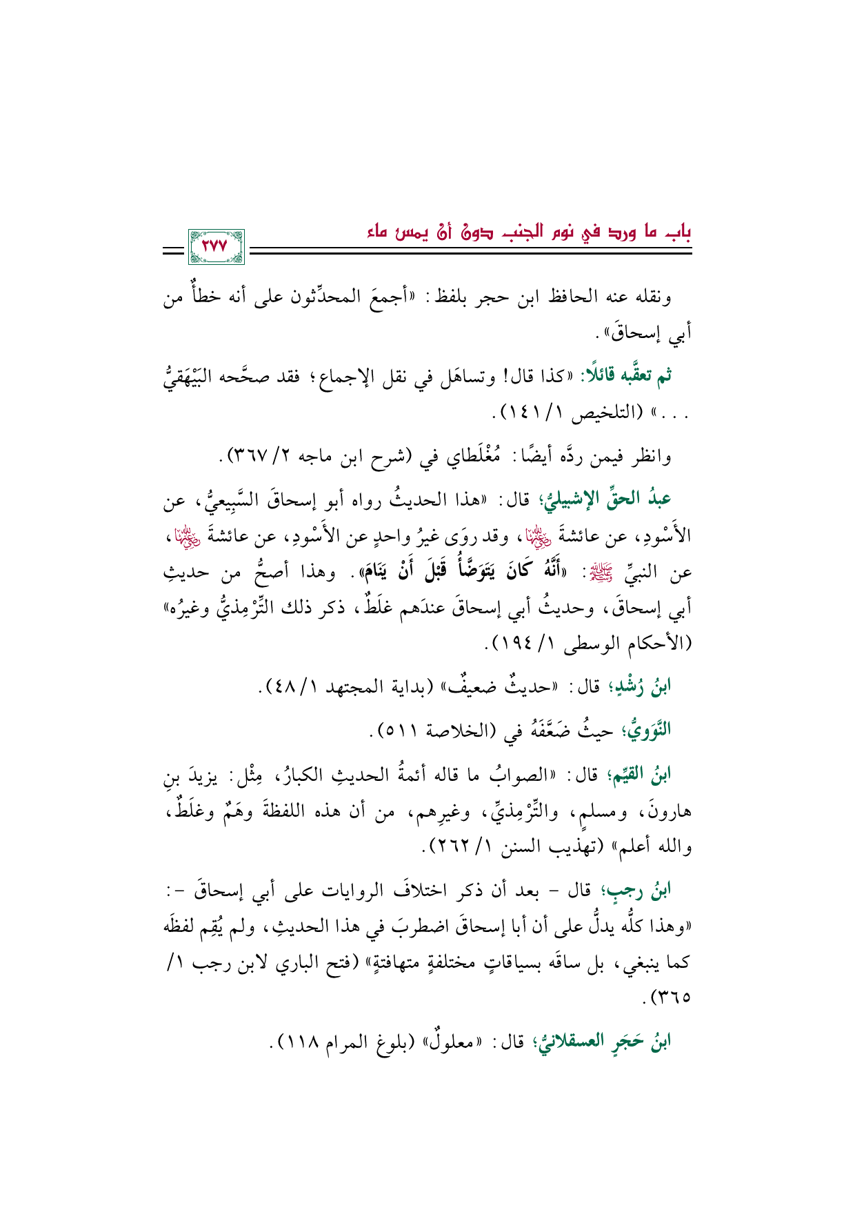 * عبدُ الحقِّ الإشبيليُّ؛ قال: "هذا الحديثُ رواه أبو إسحاقَ السَّبِيعيُّ، عن الأَسْودِ، عن عائشةَ رضي الله عنها، وقد روَى غيرُ واحدٍ عن الأَسْودِ، عن عائشةَ رضي الله عنها، عن النبيِّ صلى الله عليه وسلم: ((أَنَّهُ كَانَ يَتَوَضَّأُ قَبْلَ أَنْ يَنَامَ)). وهذا أصحُّ من حديثِ أبي إسحاقَ، وحديثُ أبي إسحاقَ عندَهم غلَطٌ، ذكر ذلك التِّرْمِذيُّ وغيرُه" (الأحكام الوسطى ١/ ١٩٤).