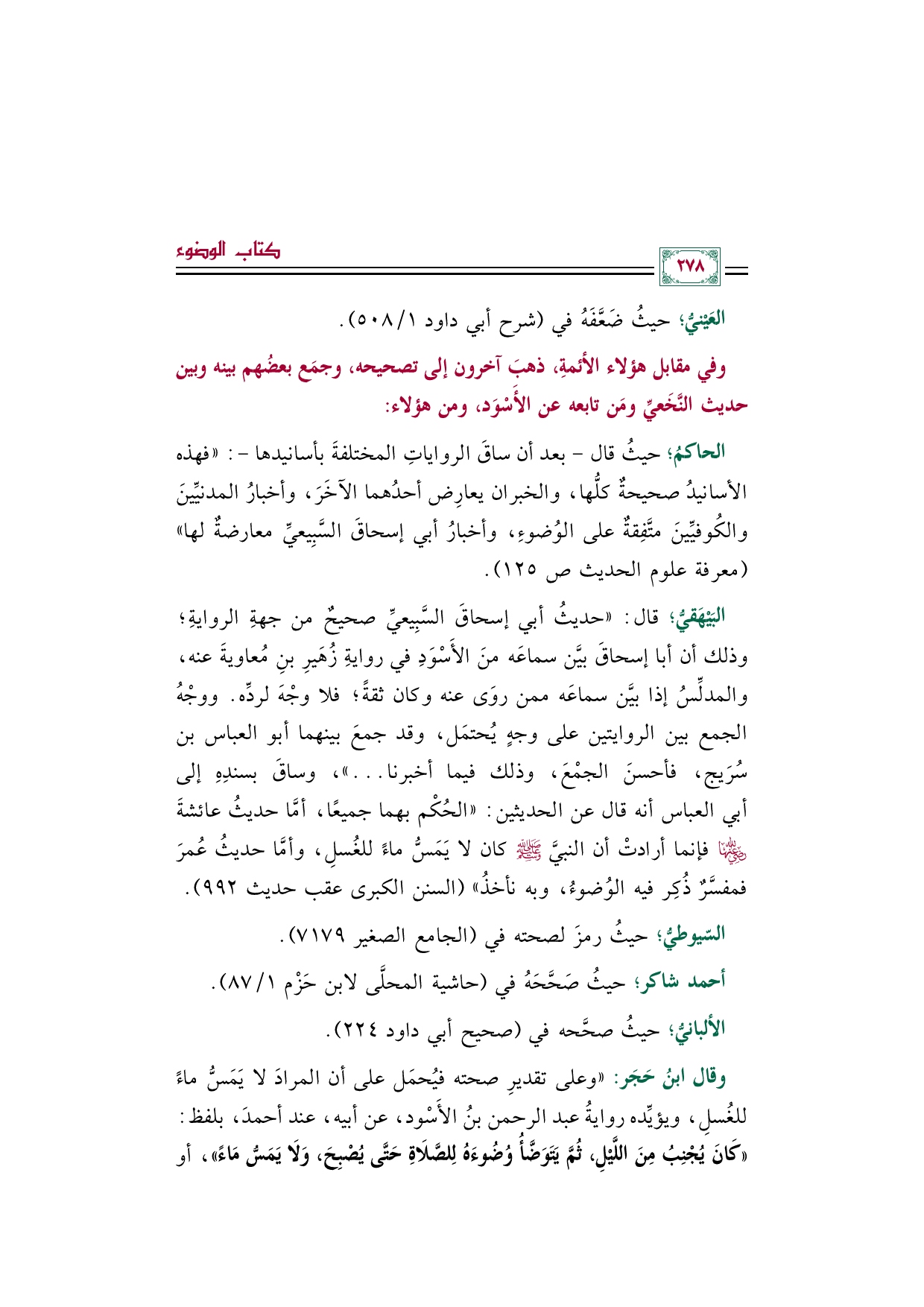 * البَيْهَقيُّ؛ قال: "حديثُ أبي إسحاقَ السَّبِيعيِّ صحيحٌ من جهةِ الروايةِ؛ وذلك أن أبا إسحاقَ بيَّن سماعَه منَ الأَسْوَدِ في روايةِ زُهَيرِ بنِ مُعاويةَ عنه، والمدلِّسُ إذا بيَّن سماعَه ممن روَى عنه وكان ثقةً؛ فلا وجْهَ لردِّه. ووجْهُ الجمع بين الروايتين على وجهٍ يُحتمَل، وقد جمعَ بينهما أبو العباس بن سُرَيج، فأحسنَ الجمْعَ، وذلك فيما أخبرنا ... "، وساقَ بسندِهِ إلى أبي العباس أنه قال عن الحديثين: "الحُكْم بهما جميعًا، أمَّا حديثُ عائشةَ رضي الله عنها فإنما أرادتْ أن النبيَّ صلى الله عليه وسلم كان لا يَمَسُّ ماءً للغُسلِ، وأمَّا حديثُ عُمرَ فمفسَّرٌ ذُكِر فيه الوُضوءُ، وبه نأخذُ" (السنن الكبرى عقب حديث ٩٩٢).
