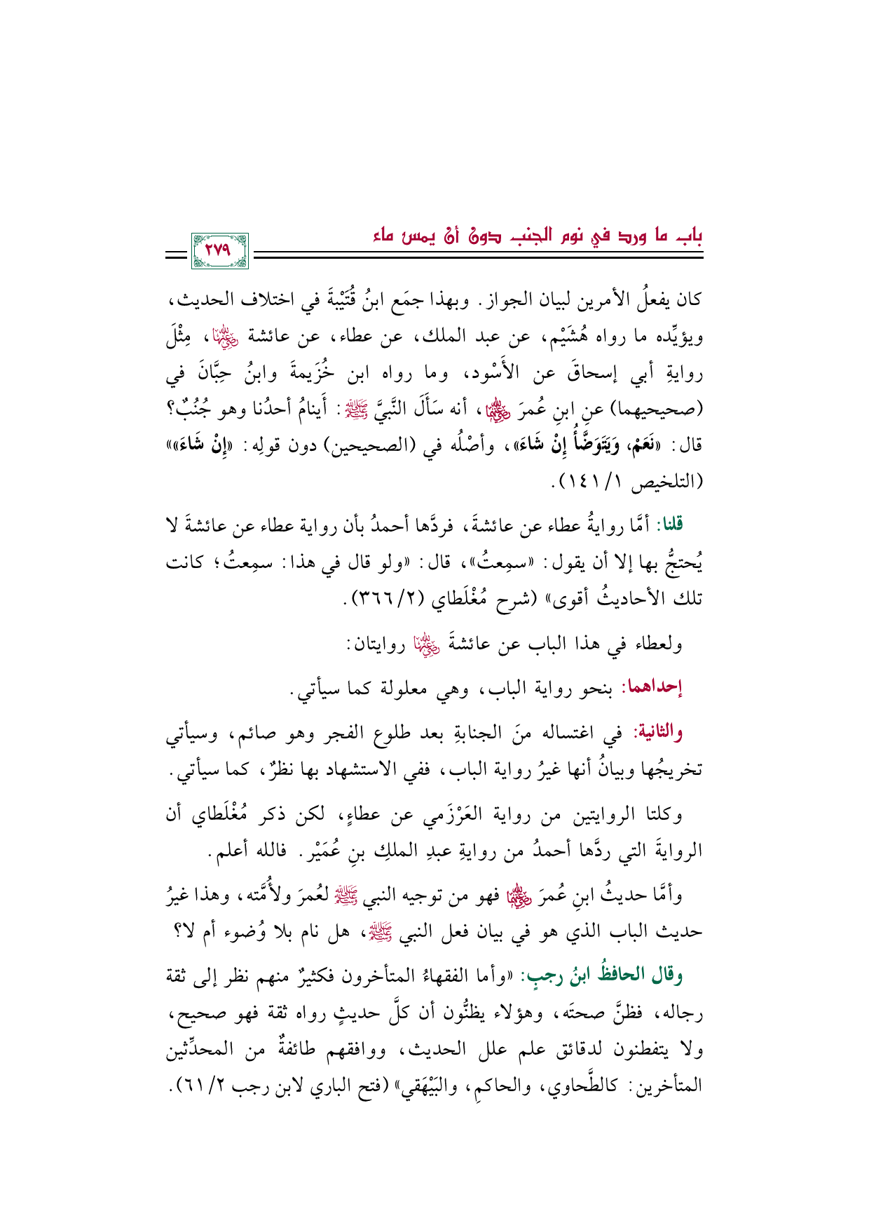 كان يفعلُ الأمرين لبيان الجواز. وبهذا جمَع ابنُ قُتَيْبةَ في اختلاف الحديث، ويؤيِّده ما رواه هُشَيْم، عن عبد الملك، عن عطاء، عن عائشة رضي الله عنها، مِثْلَ روايةِ أبي إسحاقَ عن الأَسْود، وما رواه ابن خُزَيمةَ وابنُ حِبَّانَ في (صحيحيهما) عنِ ابنِ عُمرَ رضي الله عنهما، أنه سَأَلَ النَّبيَّ صلى الله عليه وسلم: أَينامُ أحدُنا وهو جُنُبٌ؟ قال: ((نَعَمْ، وَيَتَوَضَّأُ إِنْ شَاءَ))، وأصْلُه في (الصحيحين) دون قولِه: ((إِنْ شَاءَ)) " (التلخيص ١/ ١٤١).