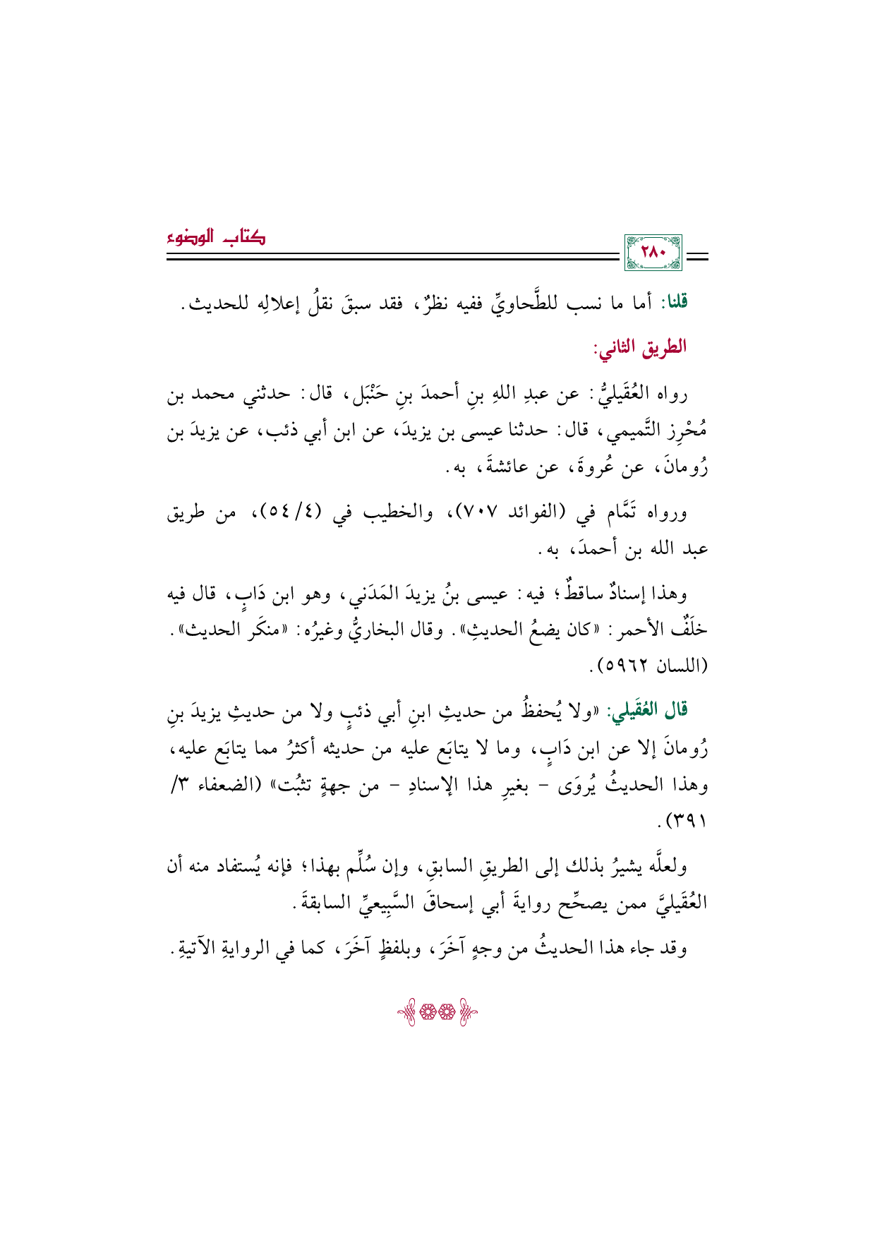 رواه العُقَيليُّ: عن عبدِ اللهِ بنِ أحمدَ بنِ حَنْبَل، قال: حدثني محمد بن مُحْرِز التَّميمي، قال: حدثنا عيسى بن يزيدَ، عن ابن أبي ذئب، عن يزيدَ بن رُومانَ، عن عُروةَ، عن عائشةَ، به.