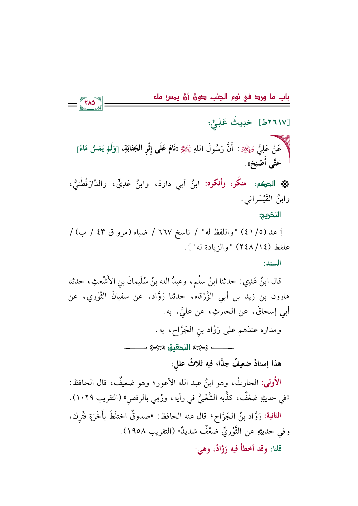 قال ابنُ عَدِي: حدثنا ابنُ سلْم، وعبدُ الله بنُ سُلَيمانَ بنِ الأَشْعثِ، حدثنا هارون بن زيد بن أبي الزَّرْقاء، حدثنا رَوَّاد، عن سفيانَ الثَّوْري، عن أبي إسحاقَ، عن الحارثِ، عن عليٍّ، به.