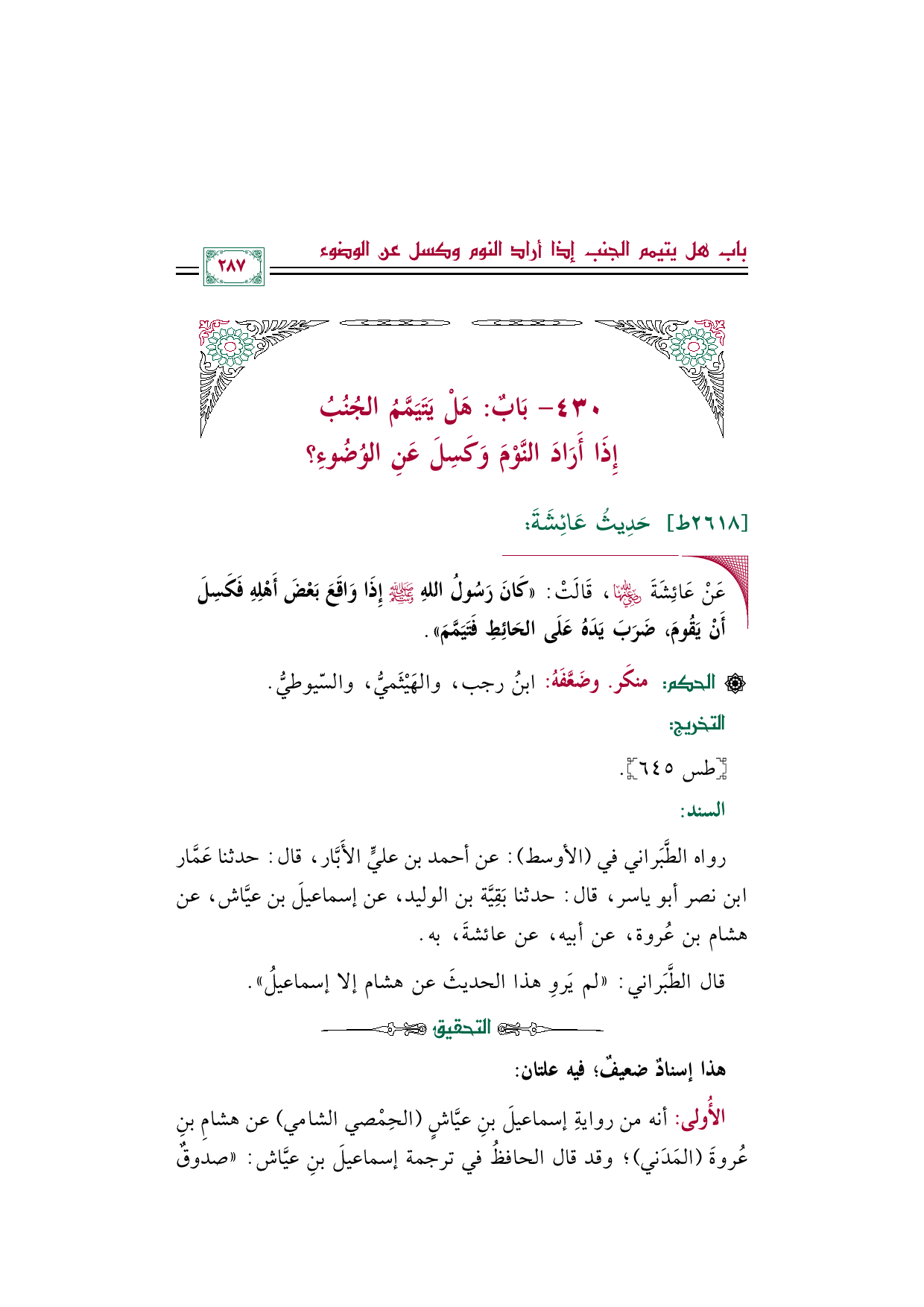 رواه الطَّبَراني في (الأوسط): عن أحمد بن عليٍّ الأَبَّار، قال: حدثنا عَمَّار بن نصر أبو ياسر، قال: حدثنا بَقِيَّة بن الوليد، عن إسماعيلَ بن عيَّاش، عن هشام بن عُروة، عن أبيه، عن عائشةَ، به.