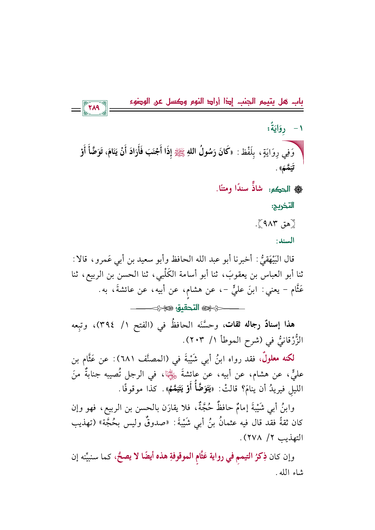 لكنه معلولٌ، فقد رواه ابنُ أبي شَيْبةَ في (المصنَّف ٦٨١): عن عَثَّام بن عليٍّ، عن هشام، عن أبيه، عن عائشةَ رضي الله عنها، في الرجل تُصيبه جنابةٌ منَ الليلِ فيريدُ أن ينامَ؟ قالتْ: ((يَتَوَضَّأُ أَوْ يَتَيَمَّمُ)). كذا موقوفًا.
