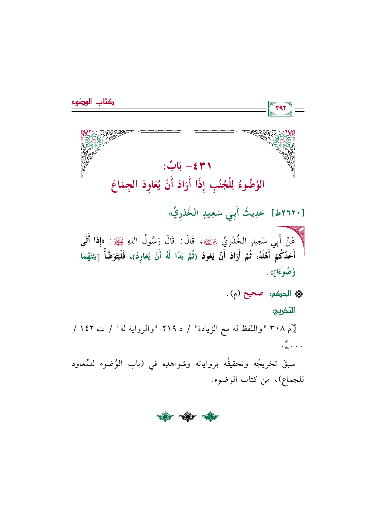 ◼ عَنْ أَبِي سَعِيدٍ الخُدْرِيِّ رضي الله عنه، قَالَ: قَالَ رَسُولُ اللهِ صلى الله عليه وسلم: ((إِذَا أَتَى أَحَدُكُمْ أَهْلَهُ، ثُمَّ أَرَادَ أَنْ يَعُودَ (ثُمَّ بَدَا لَهُ أَنْ يُعَاوِدَ)، فَلْيَتَوَضَّأْ [بَيْنَهُمَا وُضُوءًا])).