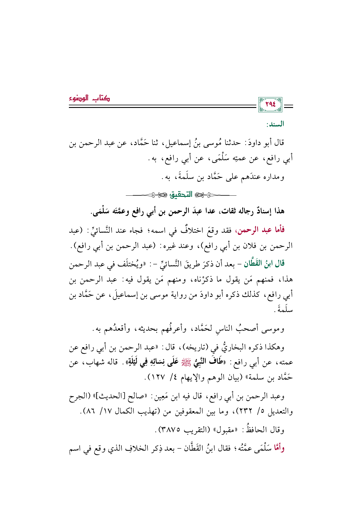 قال ابنُ القَطَّان -بعد أن ذكرَ طريقَ النَّسائيِّ-: "ويُختلَف في عبد الرحمن هذا، فمنهم مَن يقول ما ذكرْناه، ومنهم مَن يقول فيه: عبد الرحمن بن أبي رافع، كذلك ذكره أبو داودَ من رواية موسى بن إسماعيلَ، عن حَمَّاد بن سلَمةَ.
