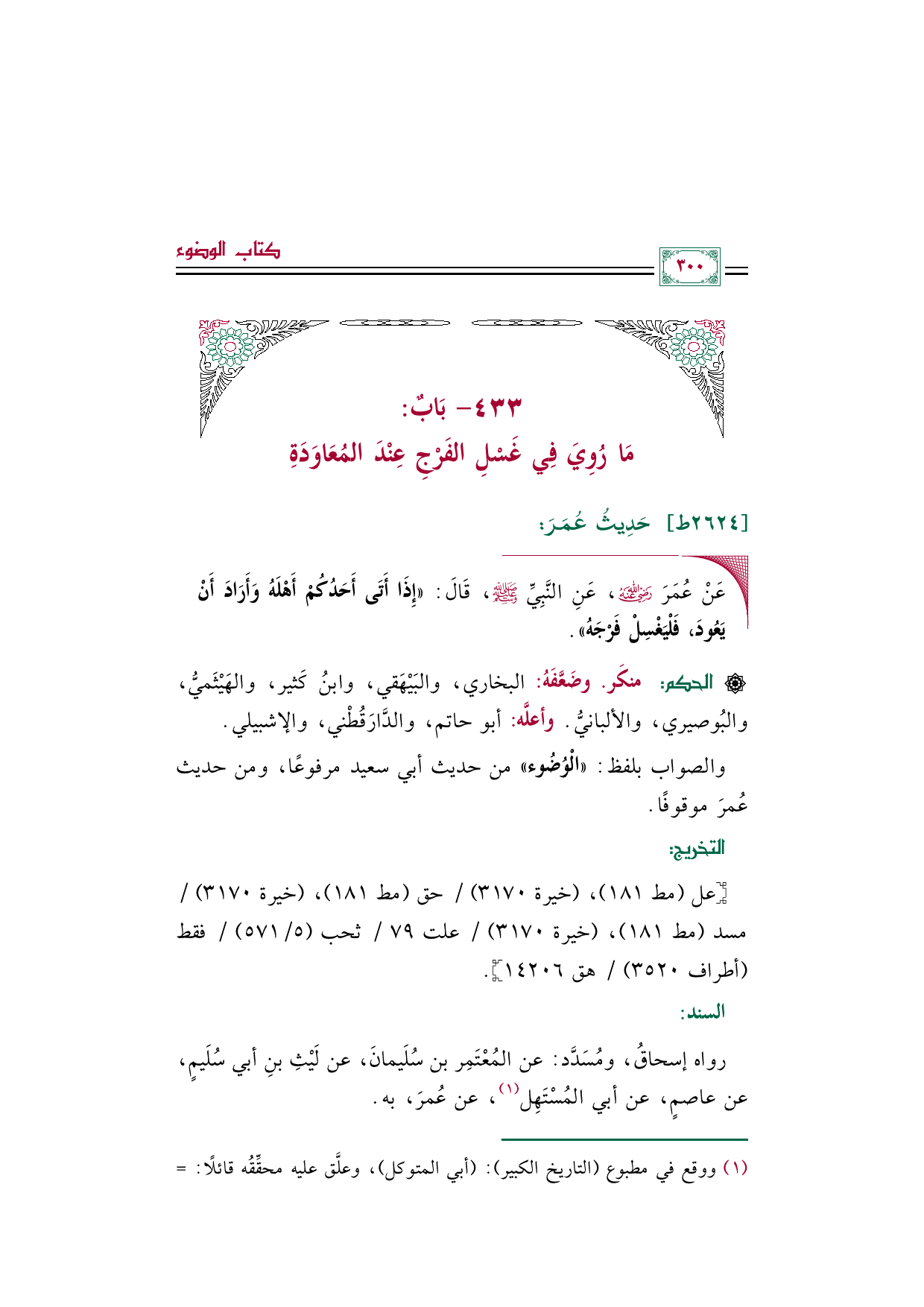 ◼ عَنْ عُمَرَ رضي الله عنه، عَنِ النَّبِيِّ صلى الله عليه وسلم، قَالَ: ((إِذَا أَتَى أَحَدُكُمْ أَهْلَهُ وَأَرَادَ أَنْ يَعُودَ، فَلْيَغْسِلْ فَرْجَهُ)).