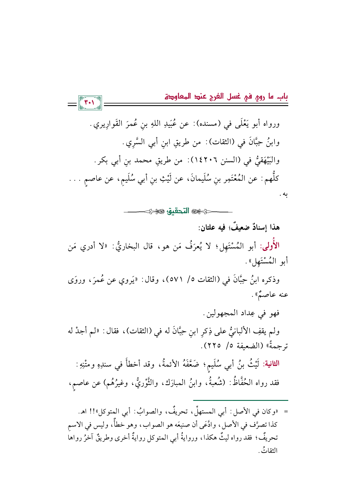 الثانية: لَيْثُ بنُ أبي سُلَيمٍ؛ ضَعَّفَهُ الأئمةُ، وقد أخطأَ في سندِهِ ومتْنِهِ:
