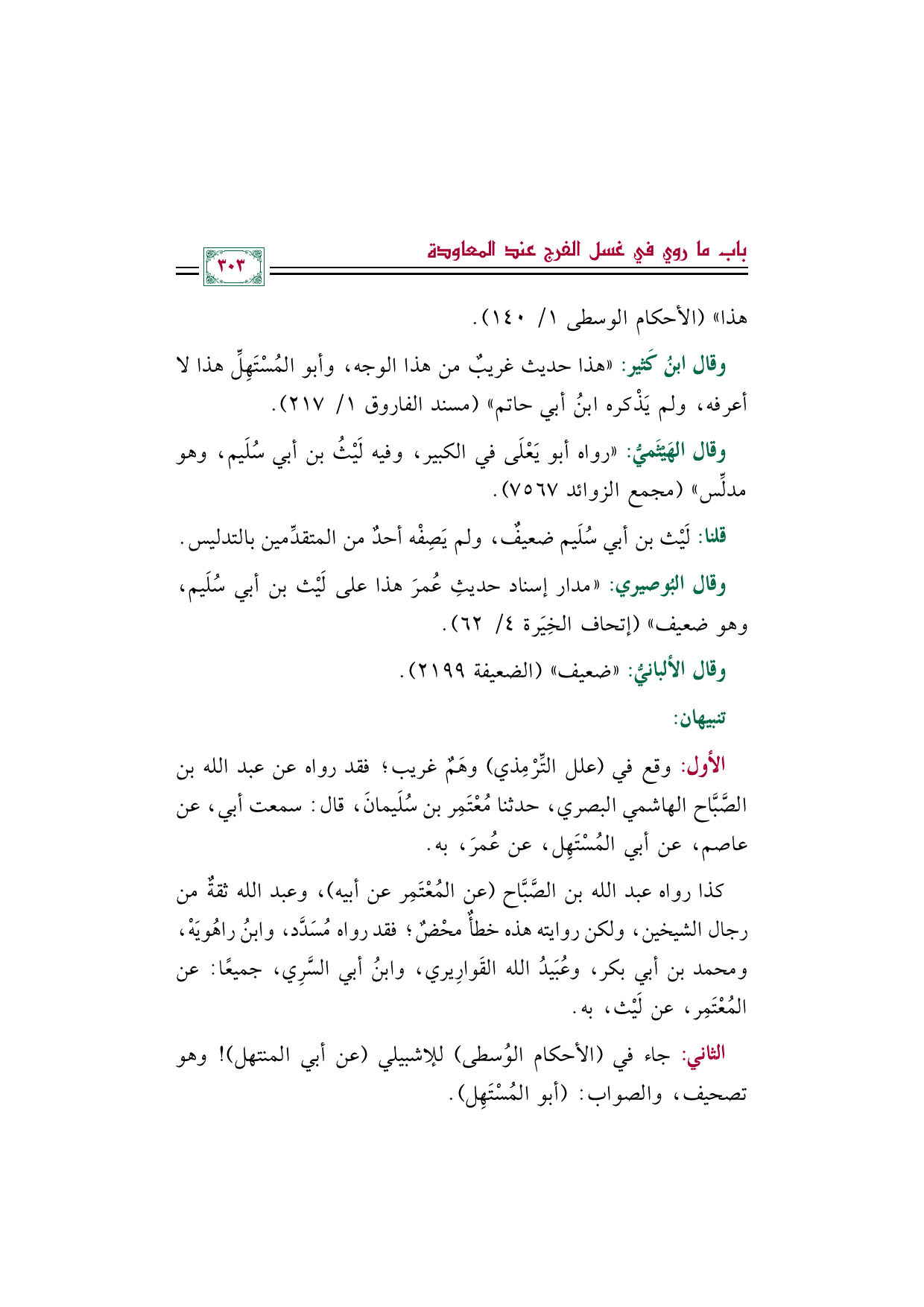 الأول: وقع في (علل التِّرْمِذي) وهَمٌ غريب؛ فقد رواه عن عبد الله بن الصَّبَّاح الهاشمي البصري، حدثنا مُعْتَمِر بن سُلَيمانَ، قال: سمعت أبي، عن عاصم، عن أبي المُسْتَهِل، عن عُمرَ، به.