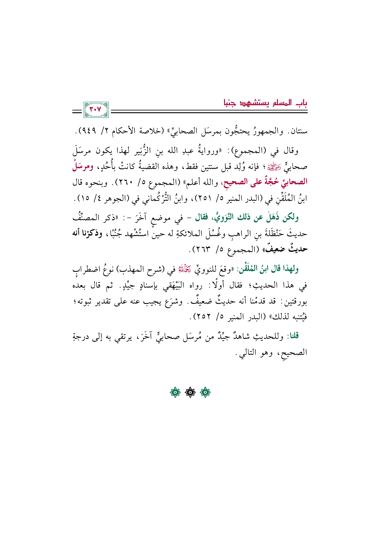 وقال في (المجموع): "وروايةُ عبدِ الله بنِ الزُّبَير لهذا يكون مرسَلَ صحابيٍّ رضي الله عنه؛ فإنه وُلِد قبل سنتين فقط، وهذه القضيةُ كانتْ بأُحُدٍ، ومرسَلُ الصحابيِّ حُجَّةٌ على الصحيحِ، والله أعلم" (المجموع ٥/ ٢٦٠). وبنحوه قال ابنُ المُلَقِّنِ في (البدر المنير ٥/ ٢٥١)، وابنُ التُّرْكُماني في (الجوهر ٤/ ١٥).
