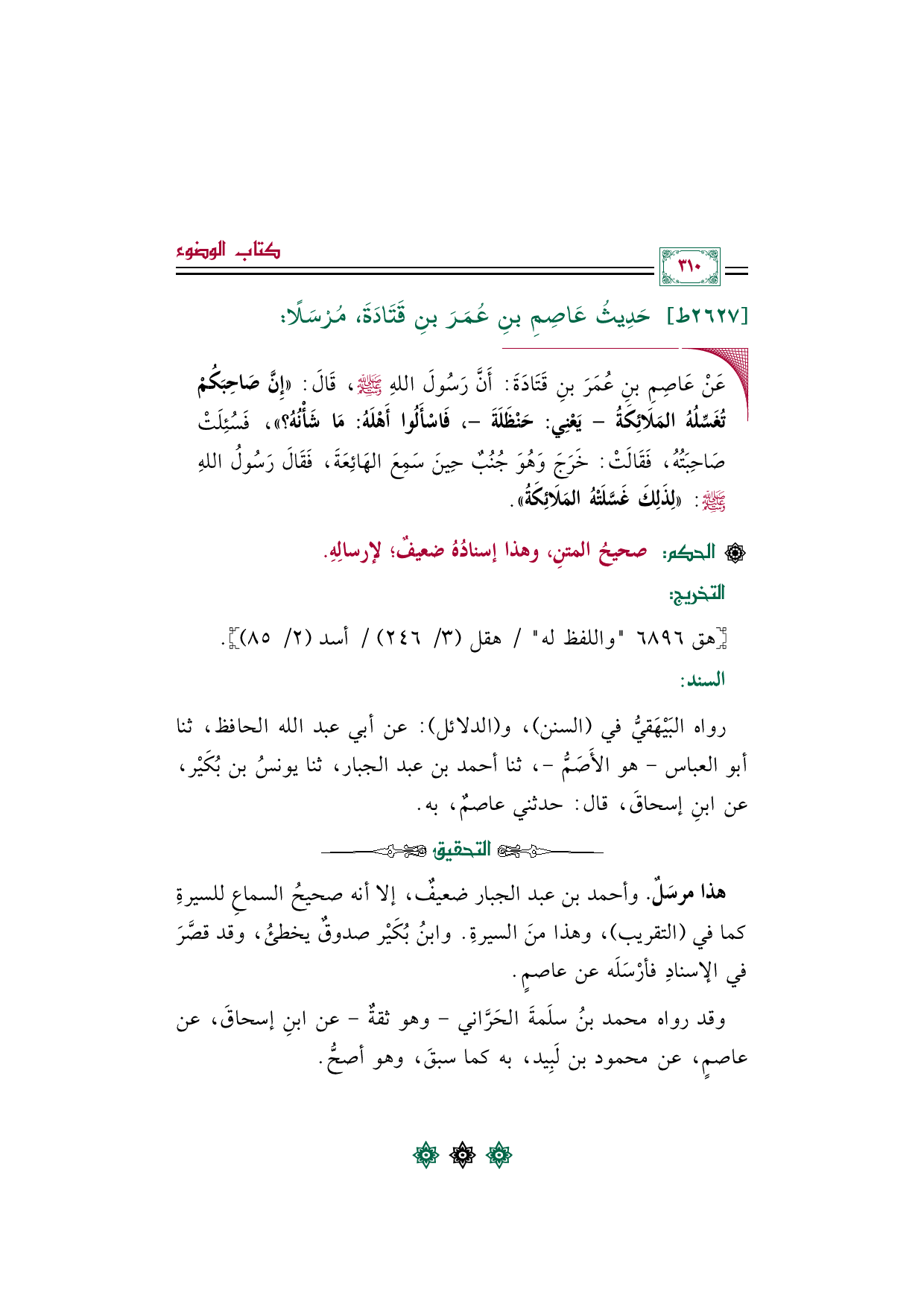 رواه البَيْهَقيُّ في (السنن)، و (الدلائل): عن أبي عبد الله الحافظ، ثنا أبو العباس -هو الأَصَمُّ-، ثنا أحمد بن عبد الجبار، ثنا يونسُ بن بُكَيْر، عن ابنِ إسحاقَ، قال: حدثني عاصمٌ، به.