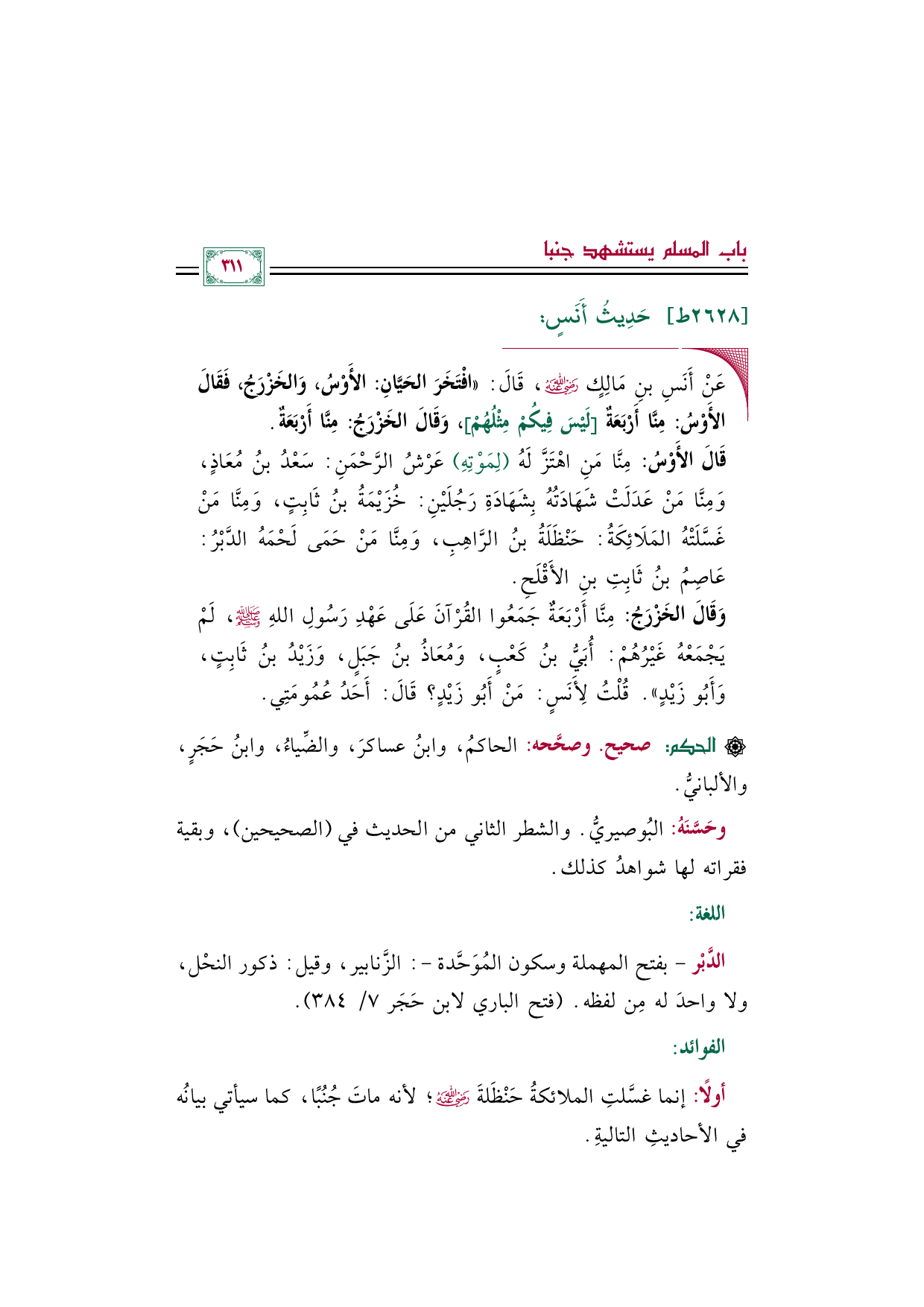 ◼ عَنْ أَنَسِ بنِ مَالِكٍ رضي الله عنه، قَالَ: ((افْتَخَرَ الحَيَّانِ: الأَوْسُ، وَالخَزْرَجُ، فَقَالَ الأَوْسُ: مِنَّا أَرْبَعَةٌ [لَيْسَ فِيكُمْ مِثْلُهُمْ]، وَقَالَ الخَزْرَجُ: مِنَّا أَرْبَعَةٌ.