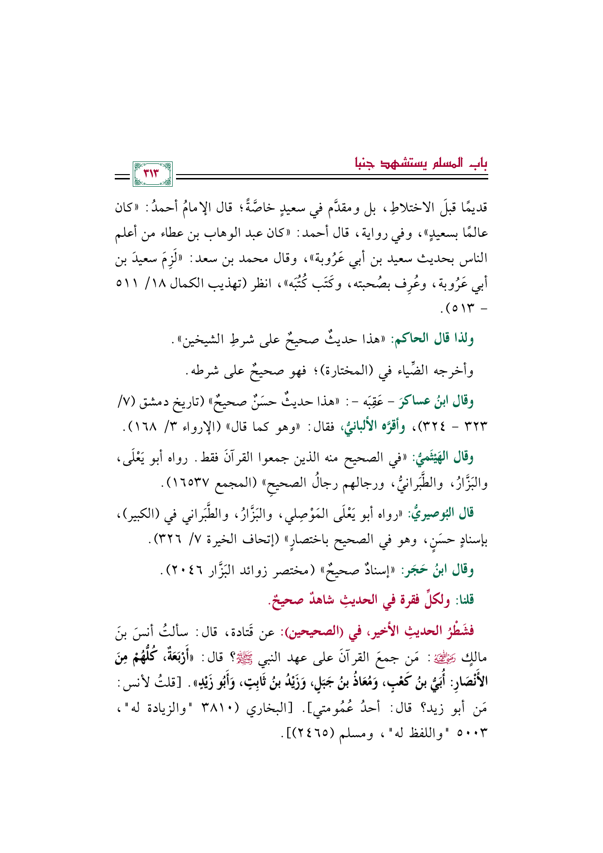 وقال الهَيْثَميُّ: "في الصحيح منه الذين جمعوا القرآنَ فقط. رواه أبو يَعْلَى، والبَزَّارُ، والطَّبَرانيُّ، ورجالهم رجالُ الصحيحِ" (المجمع ١٦٥٣٧).
