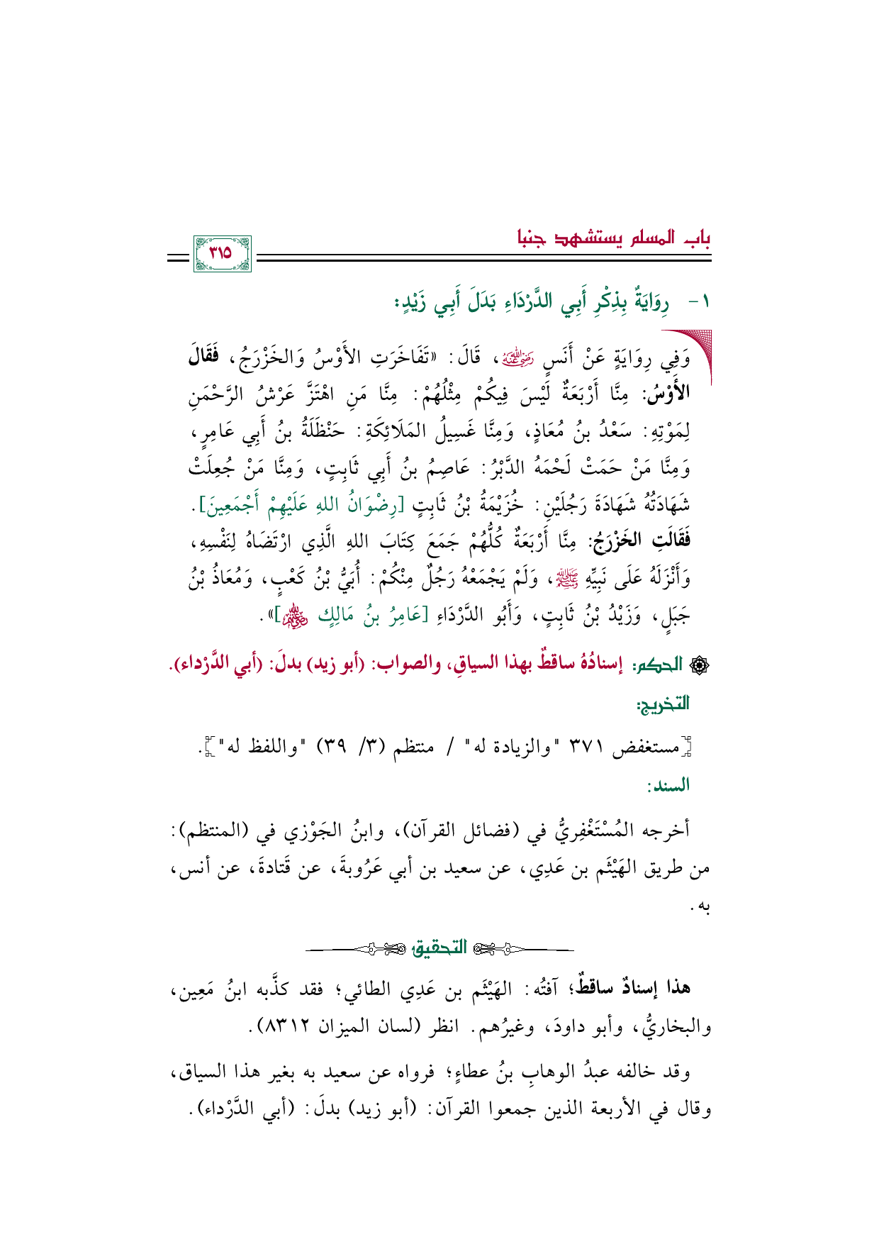 وقد خالفه عبدُ الوهابِ بنُ عطاءٍ؛ فرواه عن سعيد به بغير هذا السياق، وقال في الأربعة الذين جمعوا القرآن: (أبو زيد) بدلَ: (أبي الدَّرْداء).